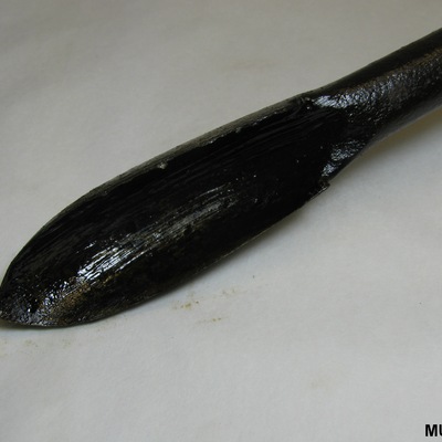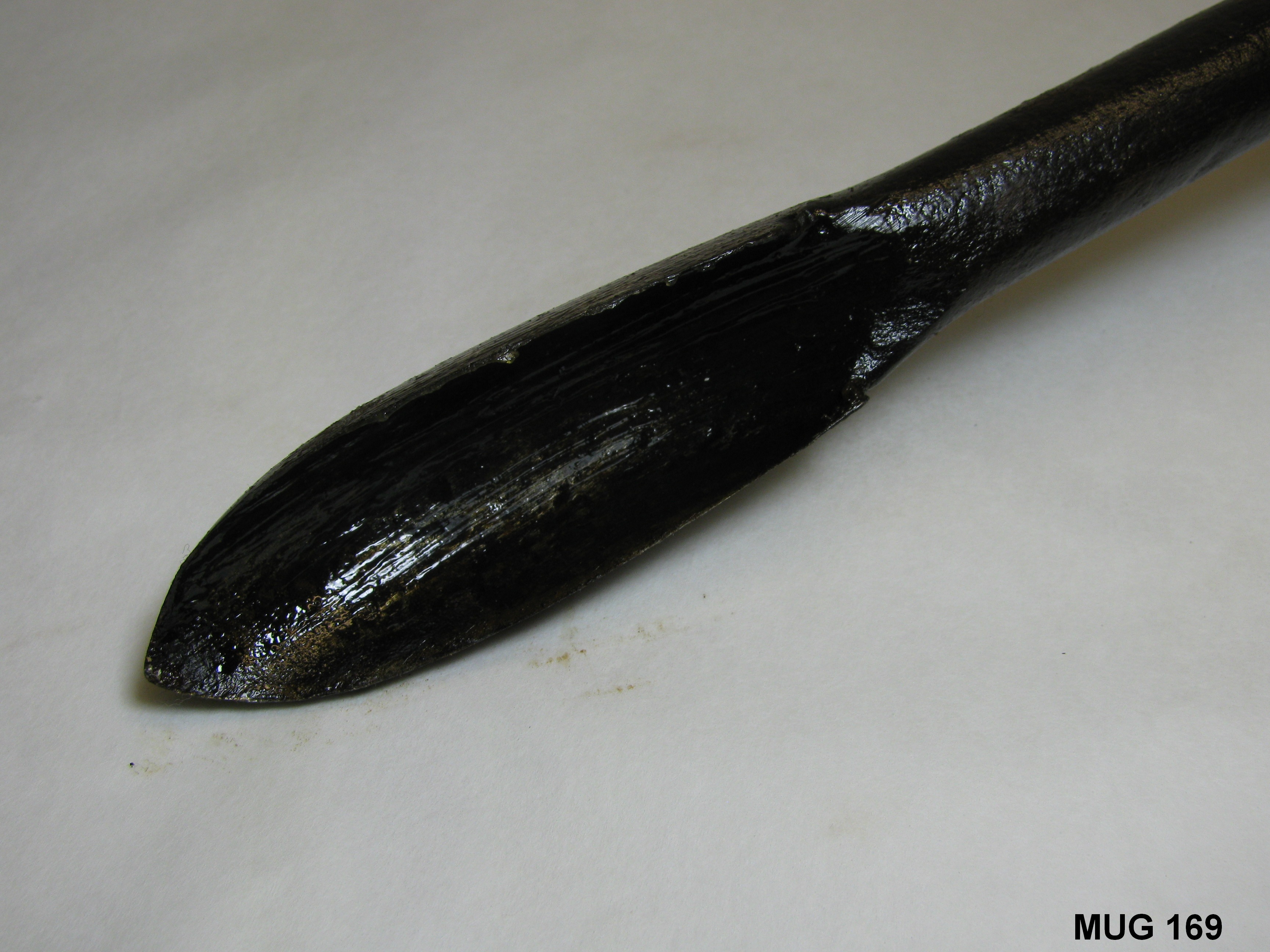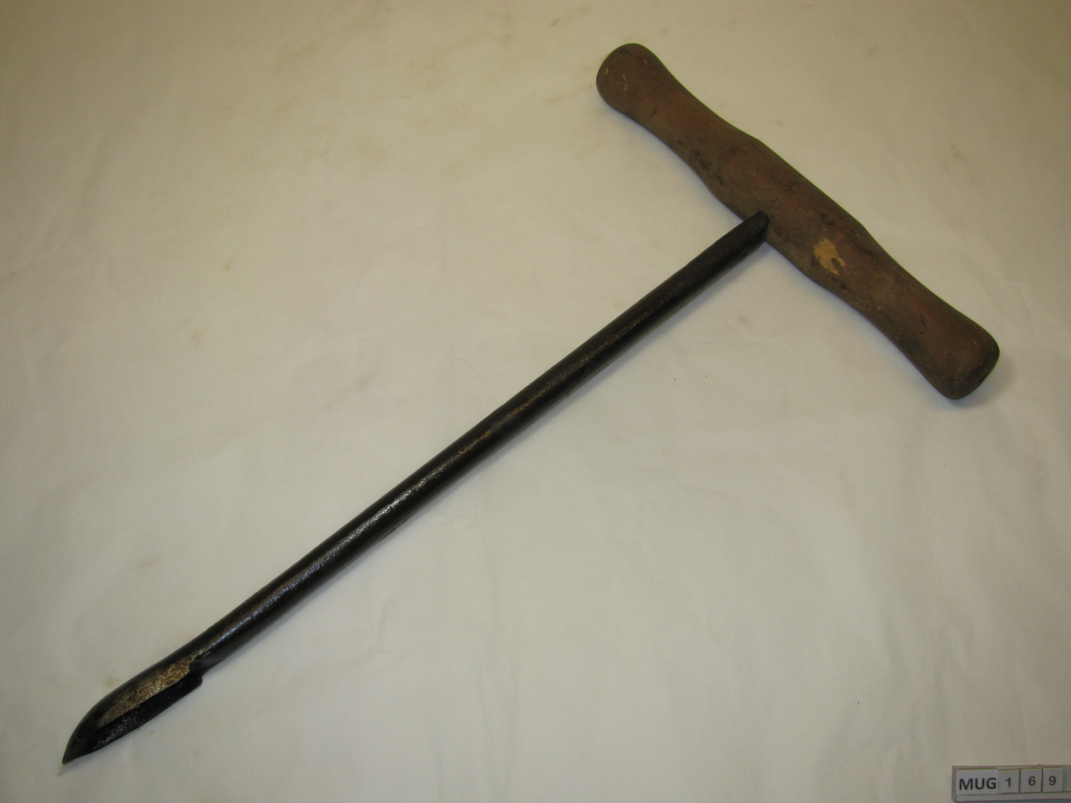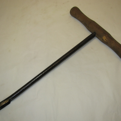 Ronde ijzeren stang met langgerekte lepelboor en rond houten handvat. Zwart, bruin.