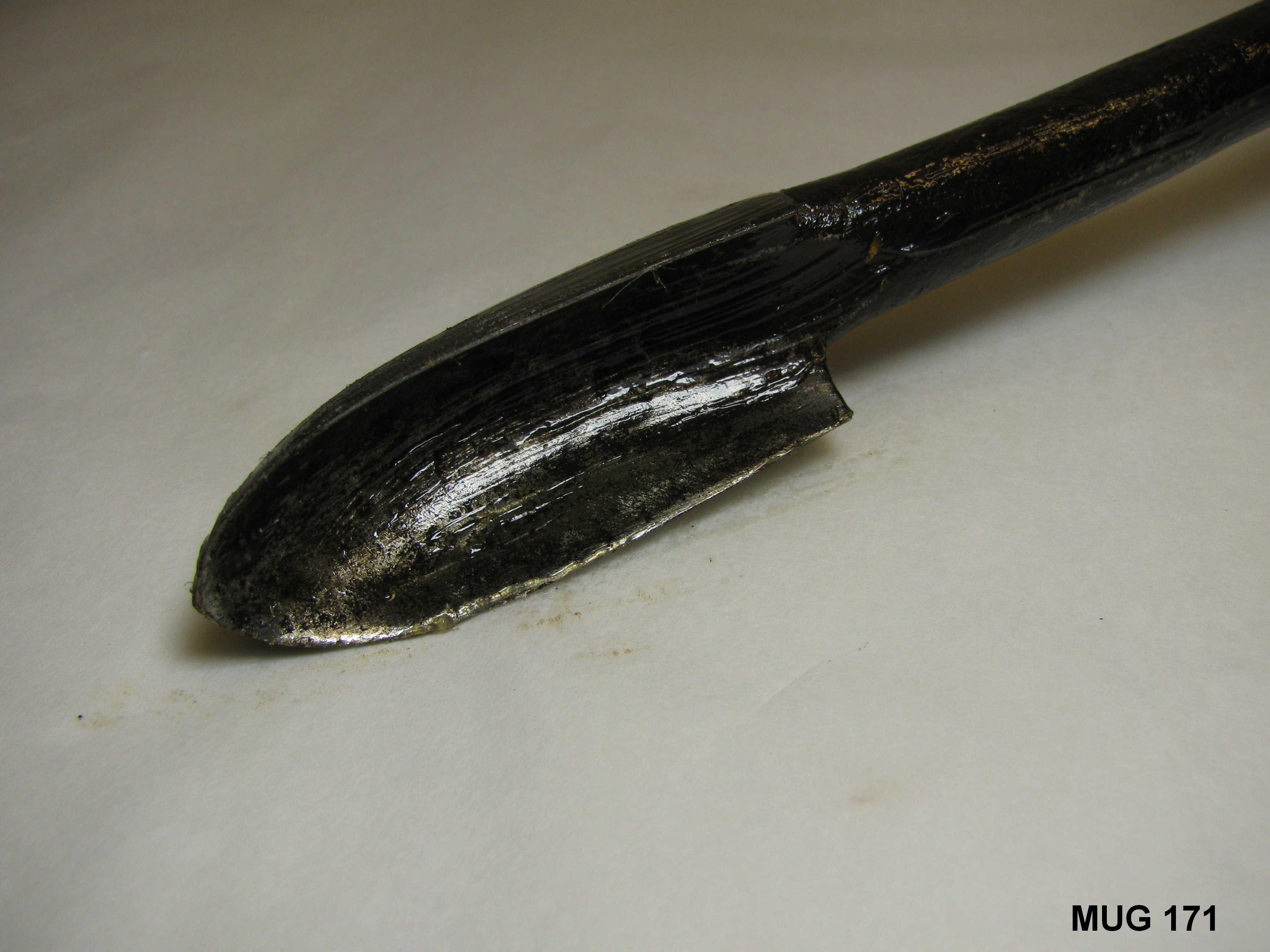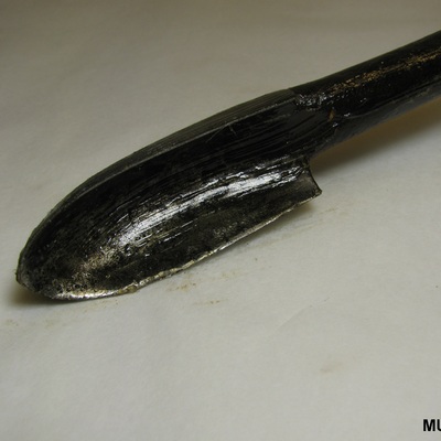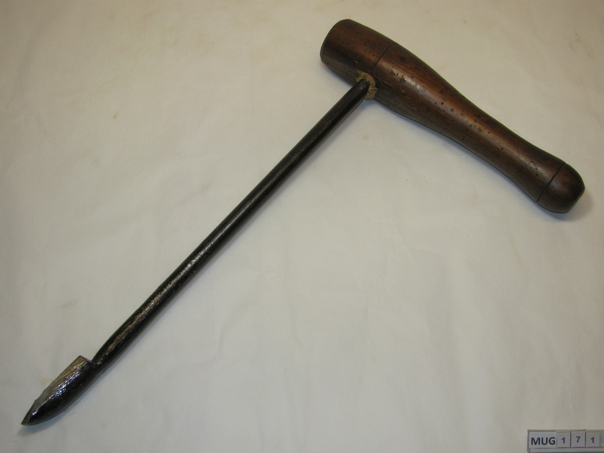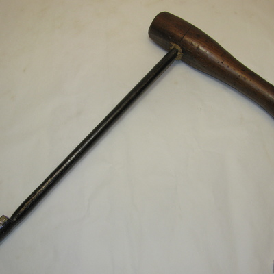 Ronde ijzeren stang met langgerekte lepelboor en rond houten handvat. De boor is niet in het midden van het handvat bevestigd. Zwart, bruin.