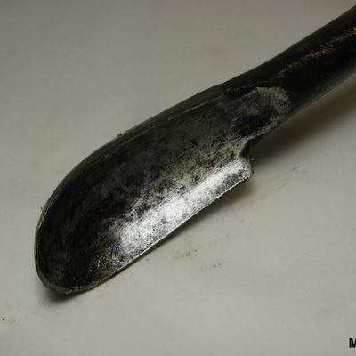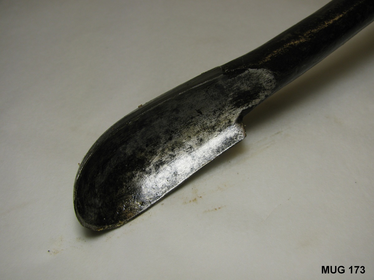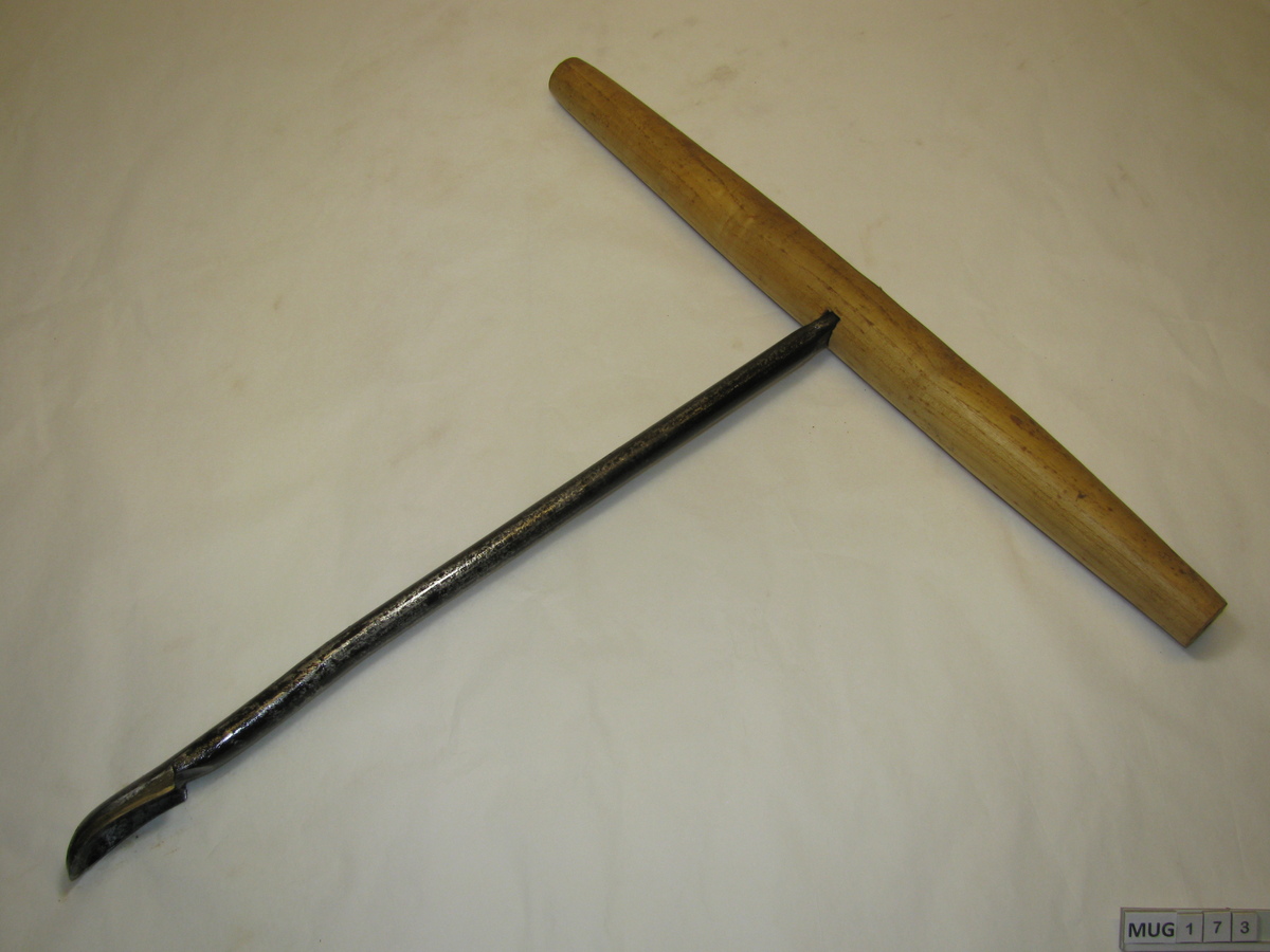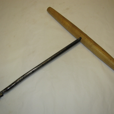 Ronde ijzeren stang met kleine lepelboor en rond houten handvat (vernieuwd). Zwart, blank.