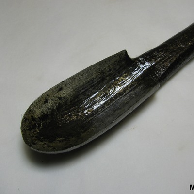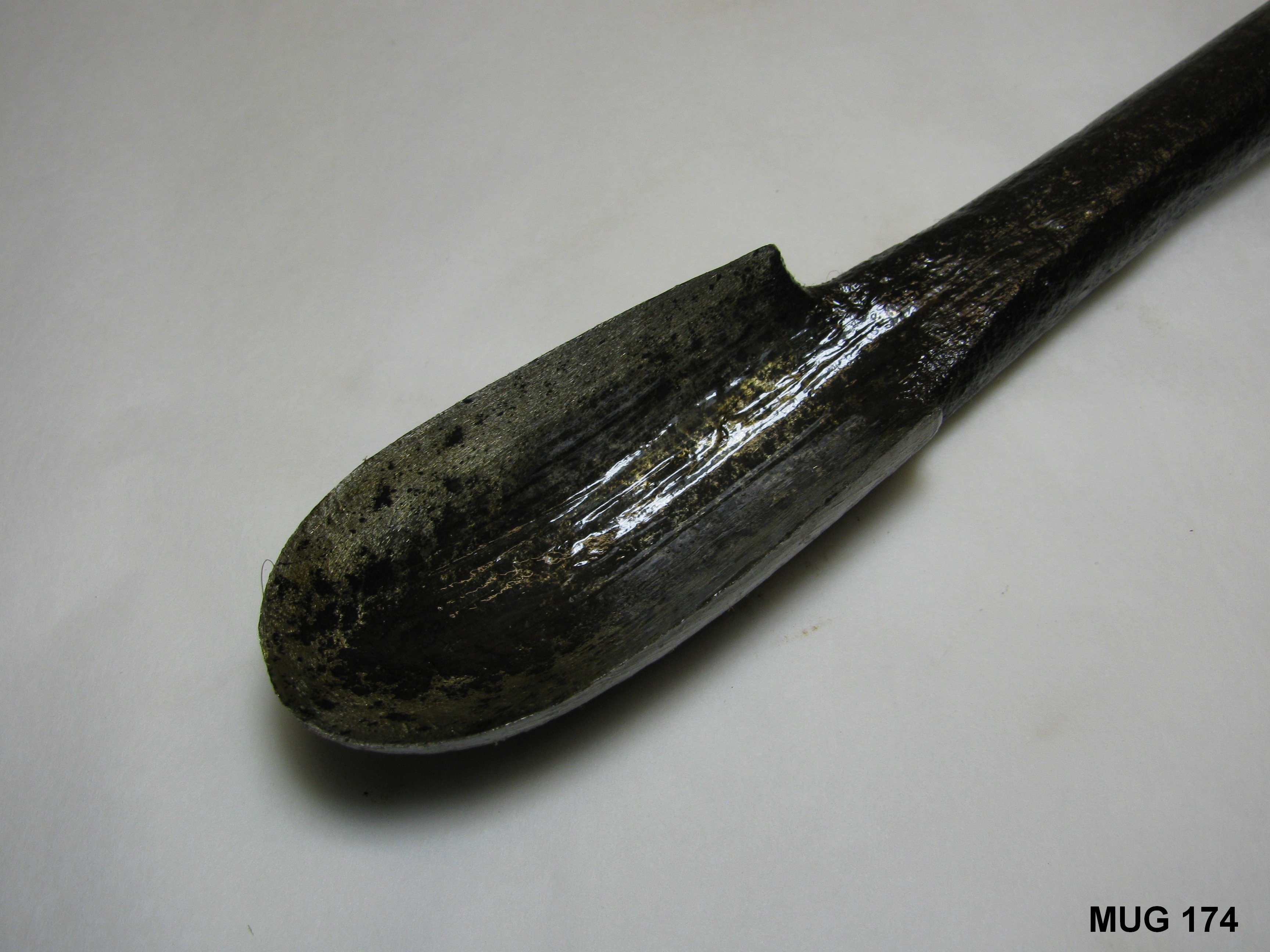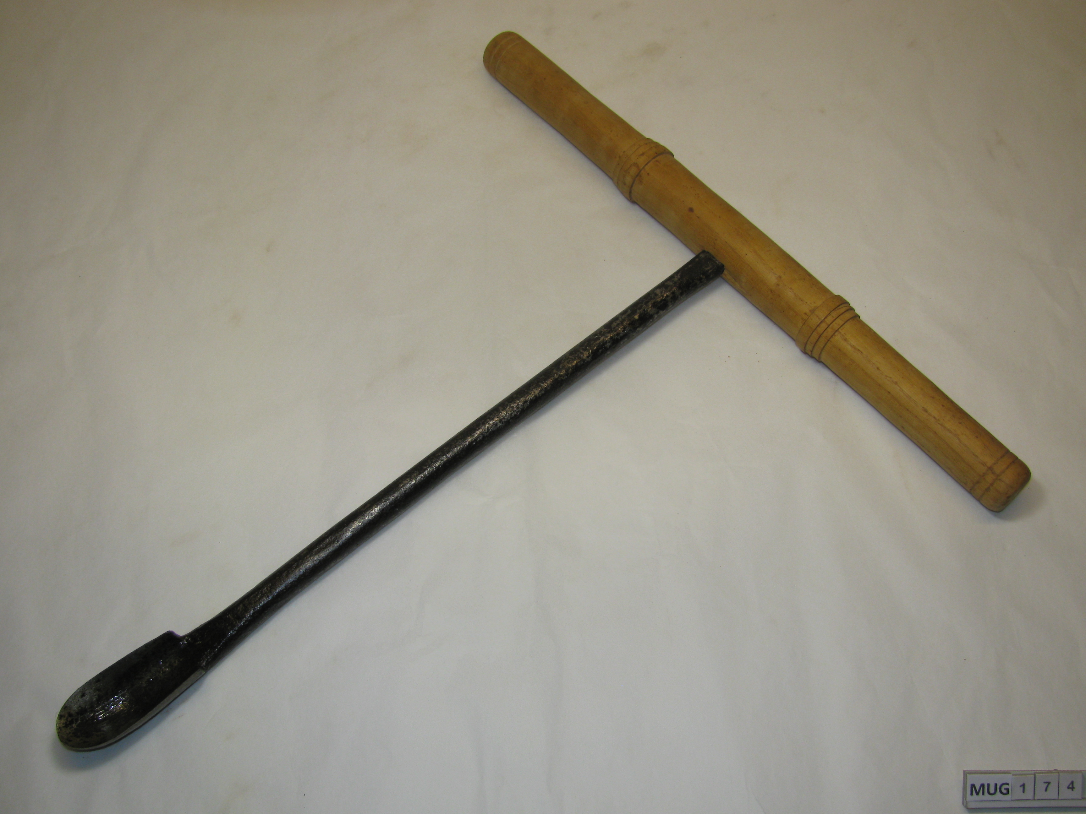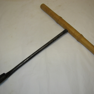 Ronde ijzeren stang met lepelboor en rond houten handvat (vernieuwd). Zwart, blank.