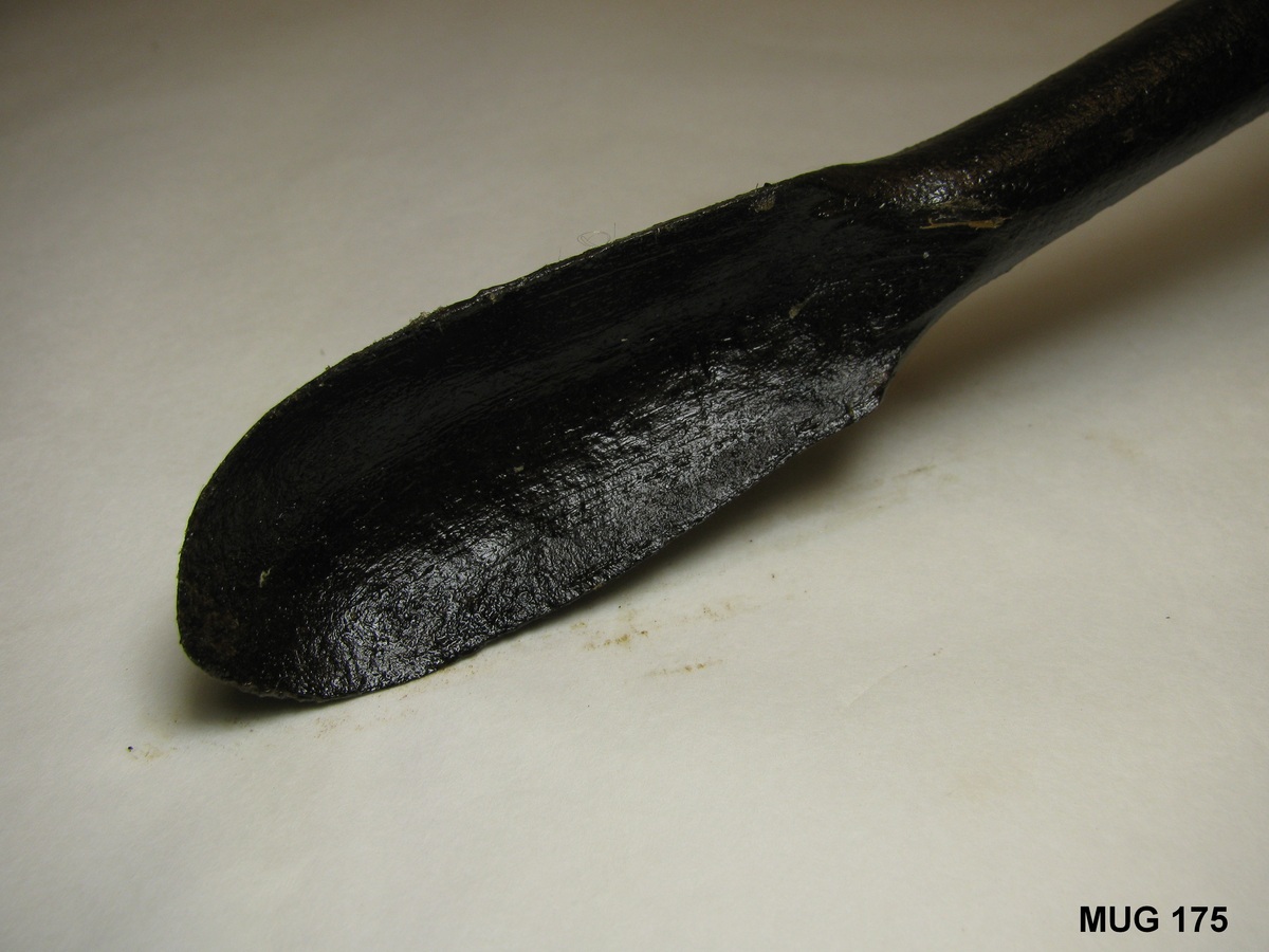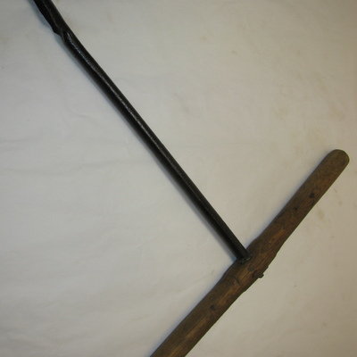 Ronde ijzeren stang met lepelboor en rond houten handvat. Zwart, bruin.