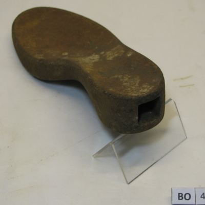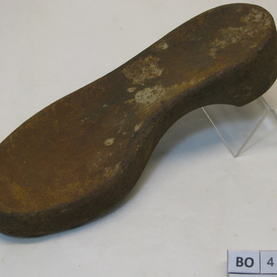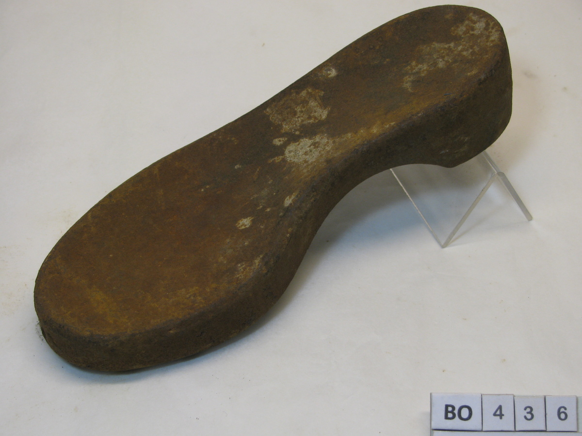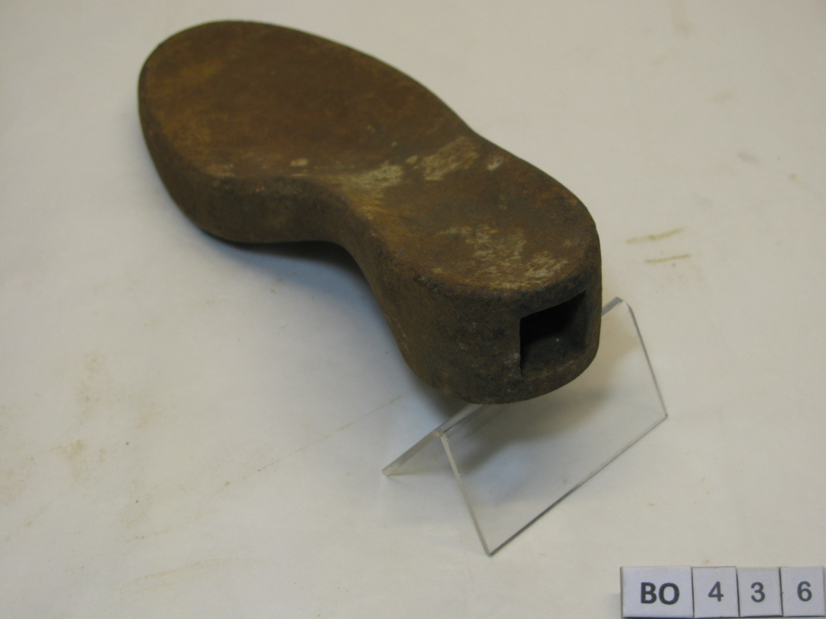 IJzeren zool met aan voor- en achterzijde rechthoekige opening voor bevestiging in machine. Voor rechtervoet.