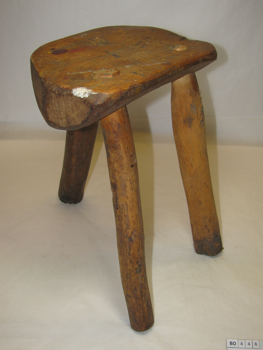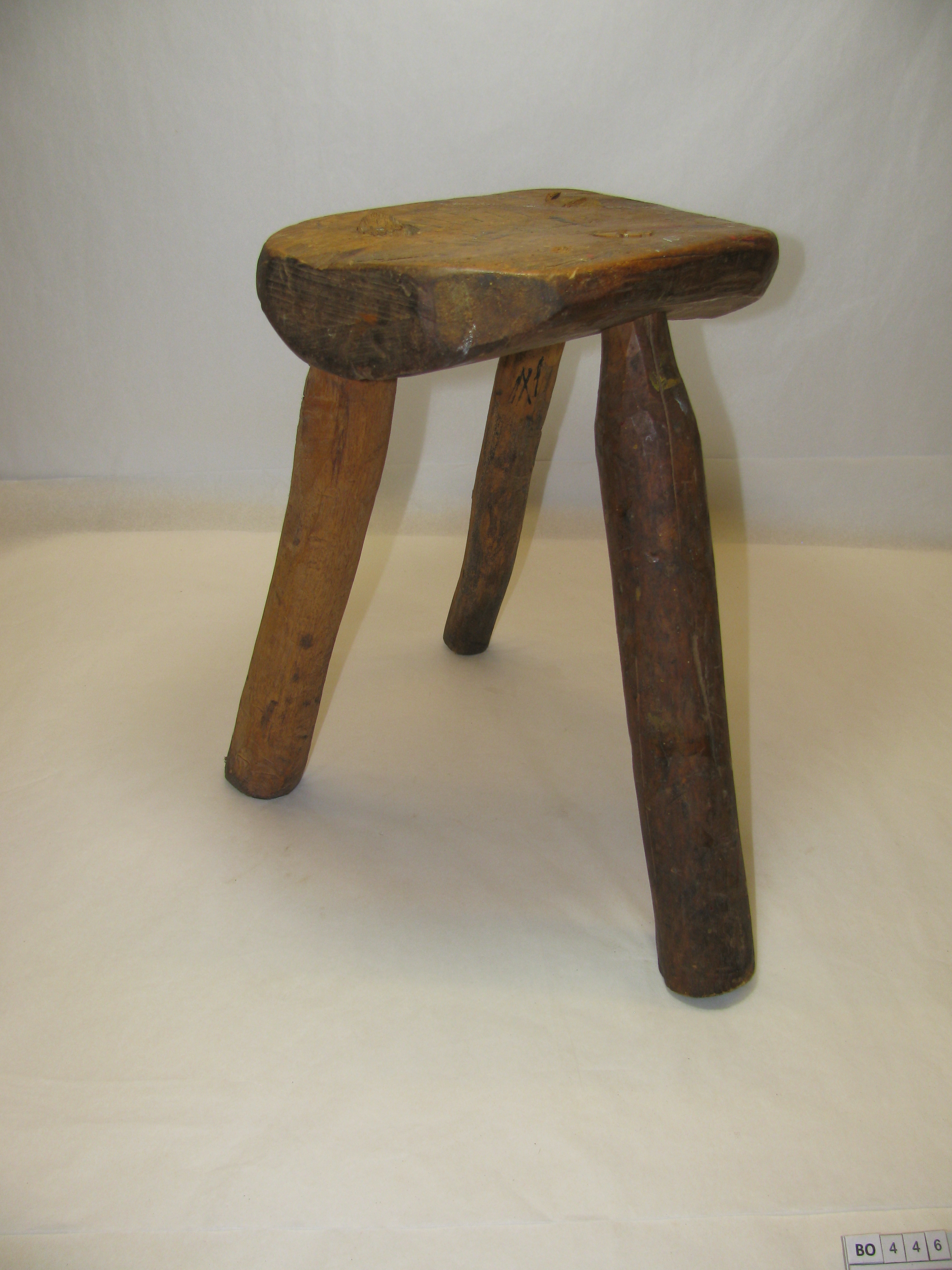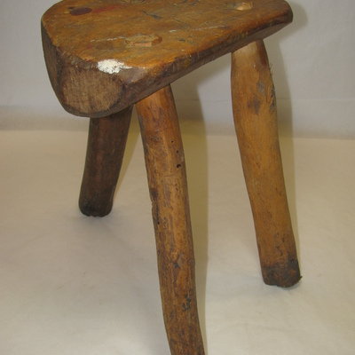 Half rond stuk hout met drie ronde gaten waarin 3 ronde poten zijn bevestigd. Bruin. Doc. plaat XIII (8).