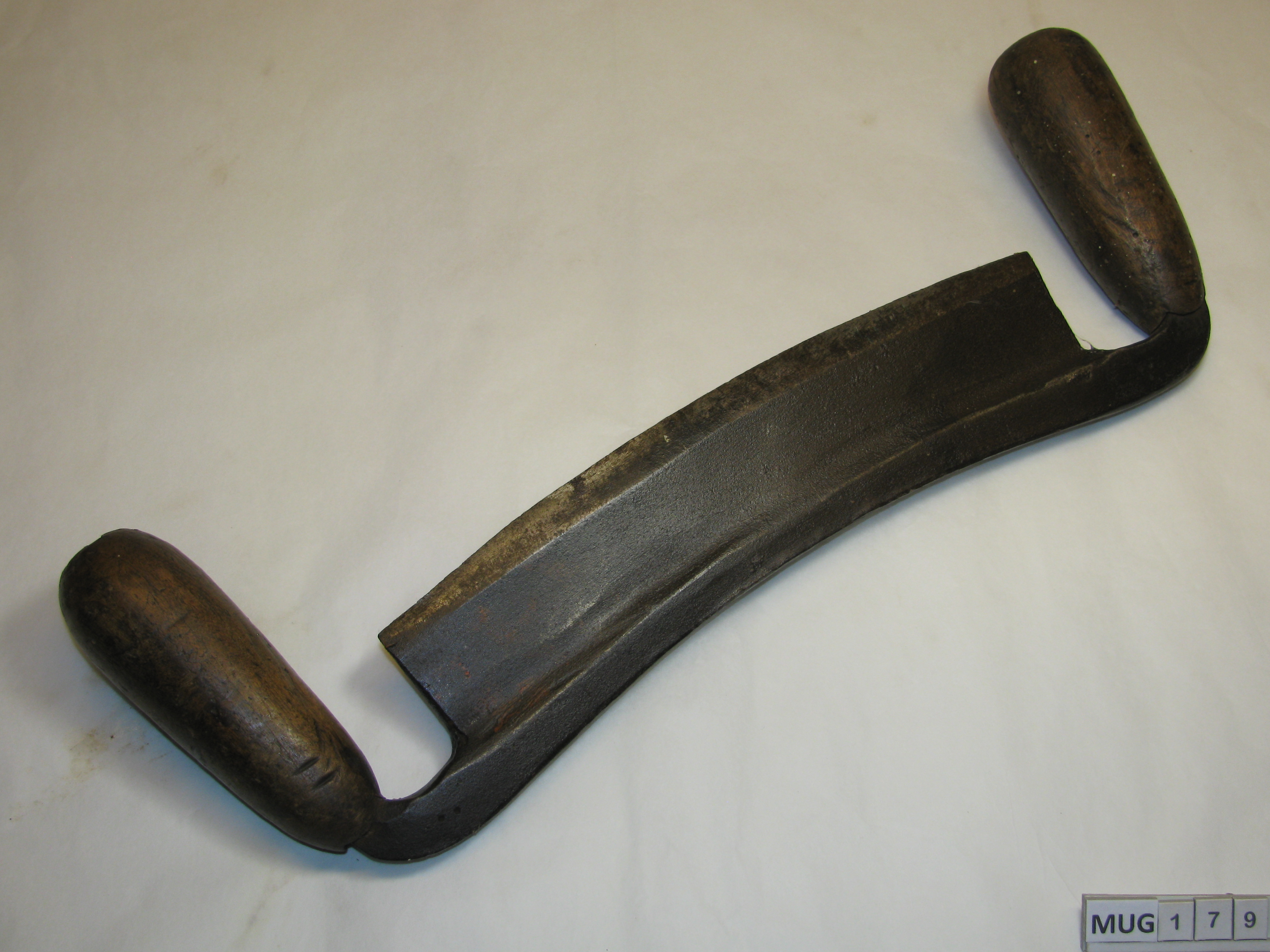 Breed, iets gebogen mes met twee taps toelopende houten handvaten. Zwart, bruin.
