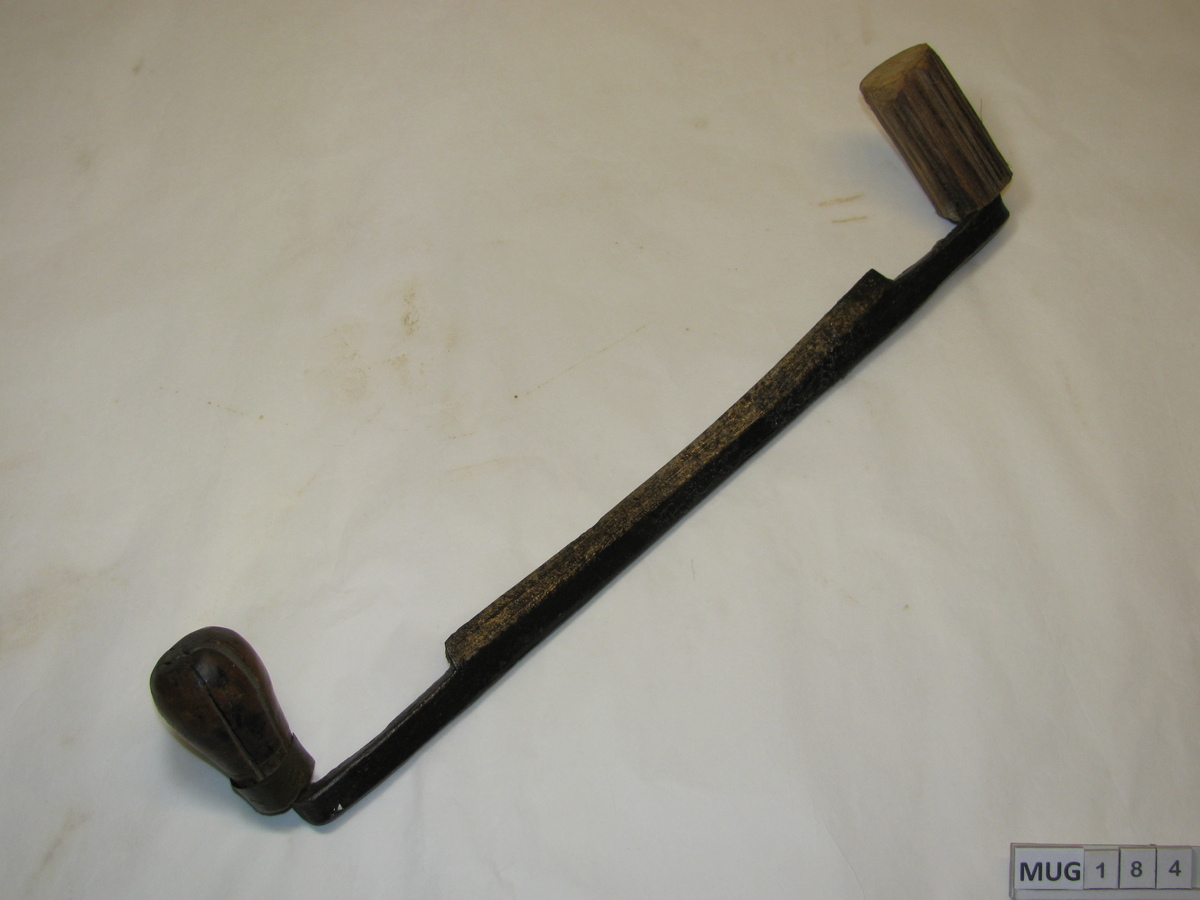 Smal ijzeren mes met twee verschillende houten handvaten (1 met gebroken koperen ringetje). Zwart, bruin.
