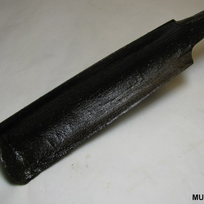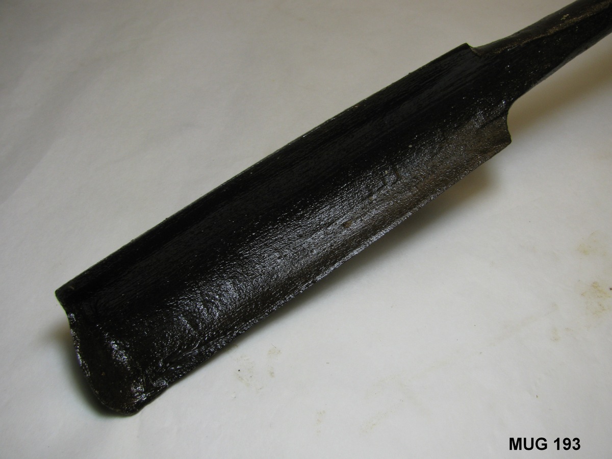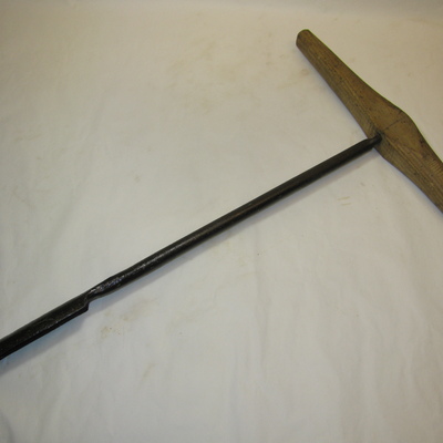 Ronde ijzeren stang met langgerekte boor en rond houten handvat. Zwart, bruin.