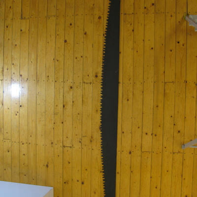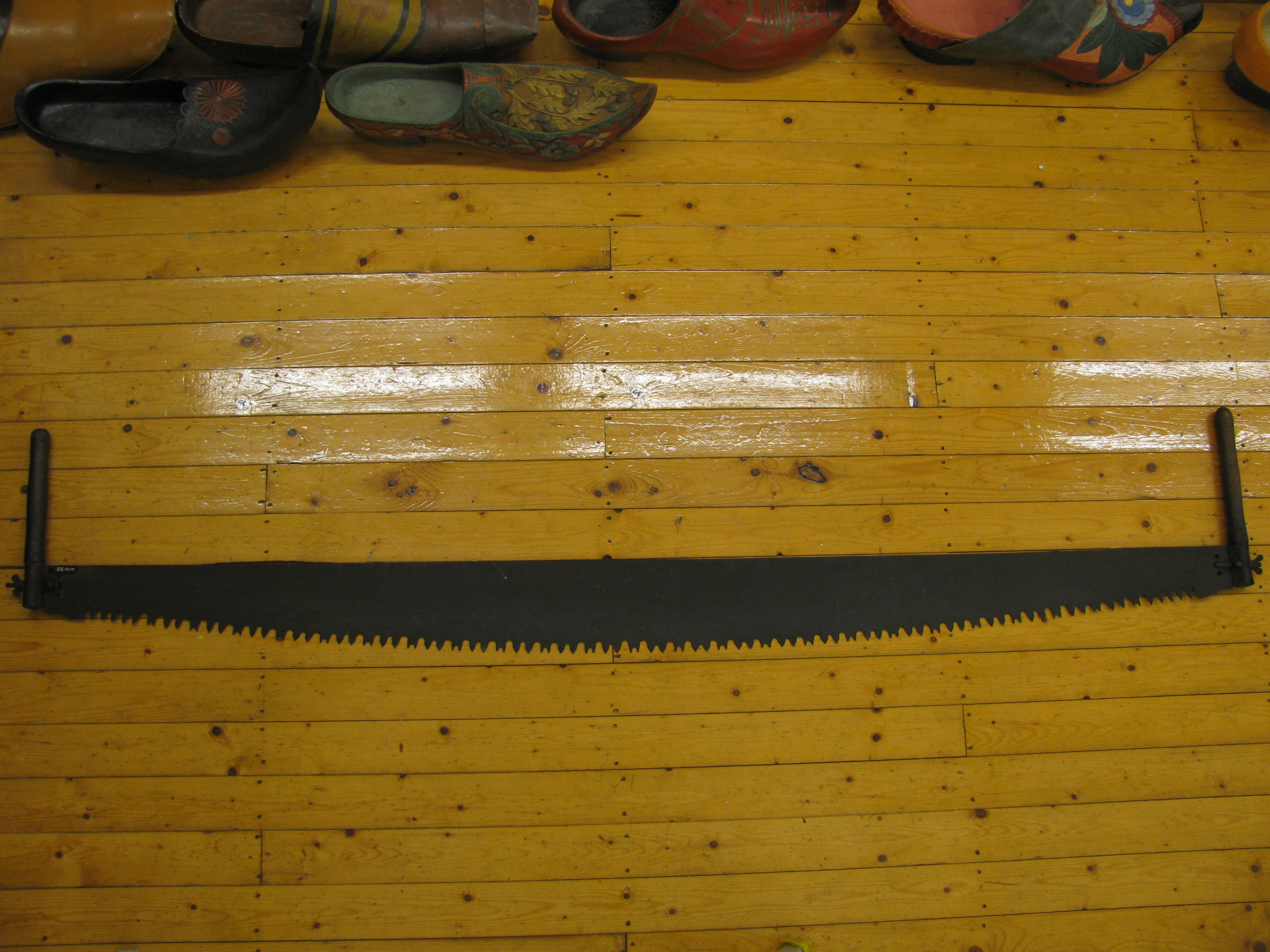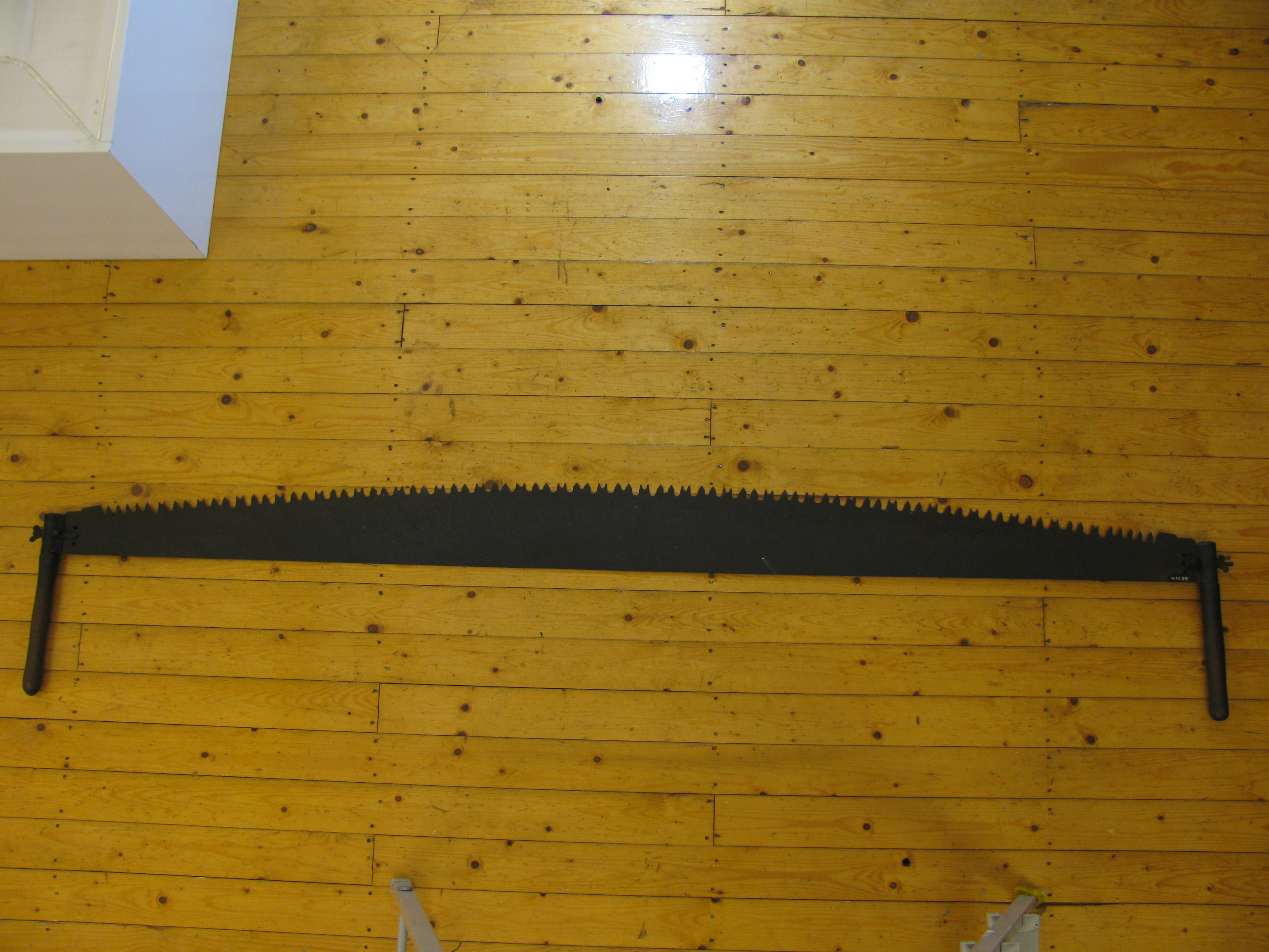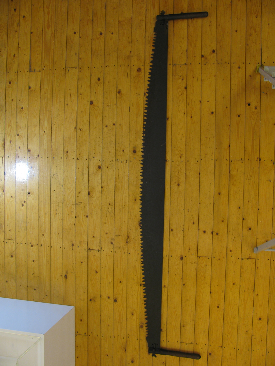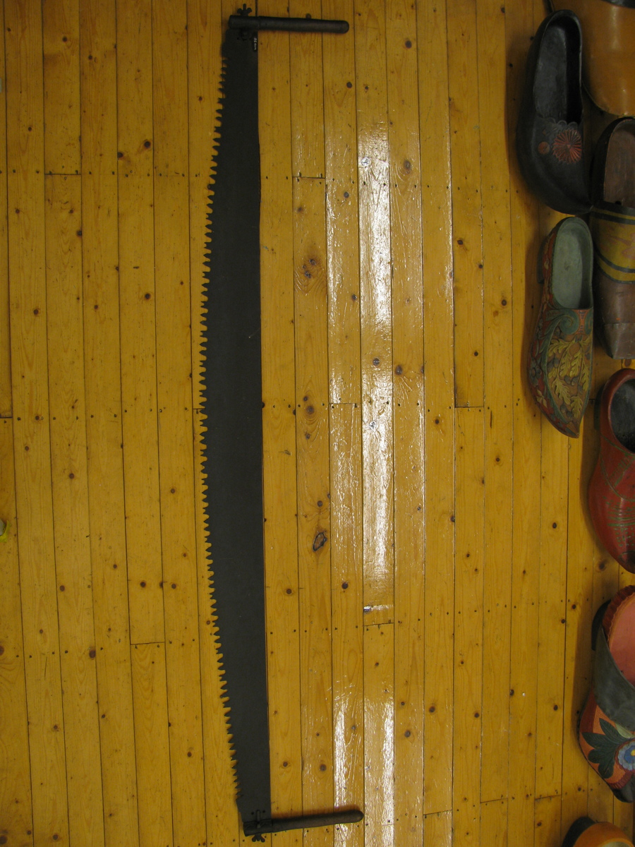 Grote trekzaag, blad heeft rechte bovenzijde en bol zaagvlak. Tanden: ronde inkeping, 2 tanden, ronde inkeping, tand met 2 kleine tanden op 1 vlak. Blad 8,5-16cm. Houten handvaten (32,5cm) met houdertje om de steen, vastgezet met vleugelmoer. Zwart, bruin.