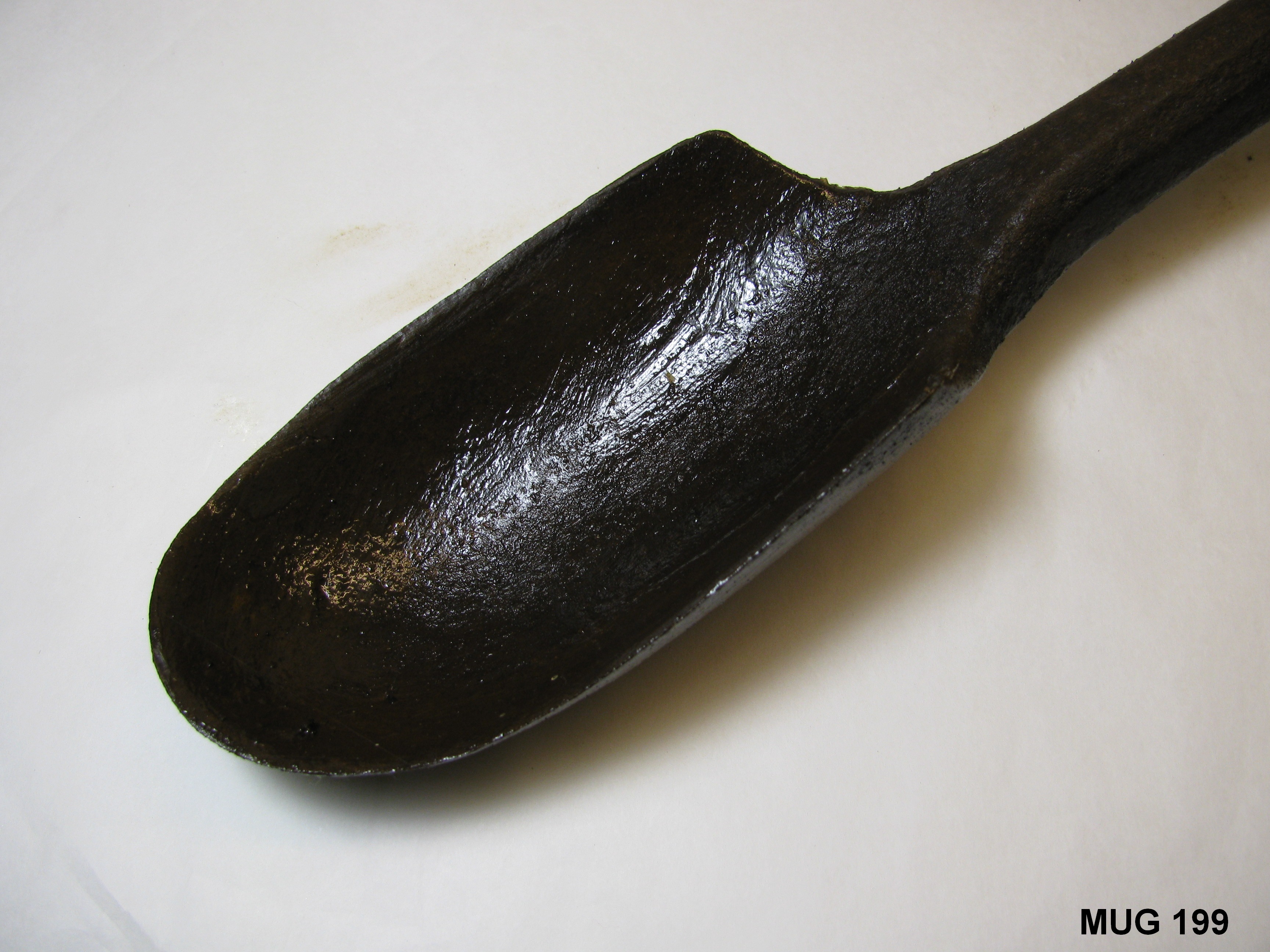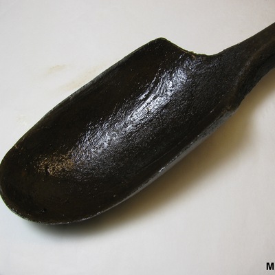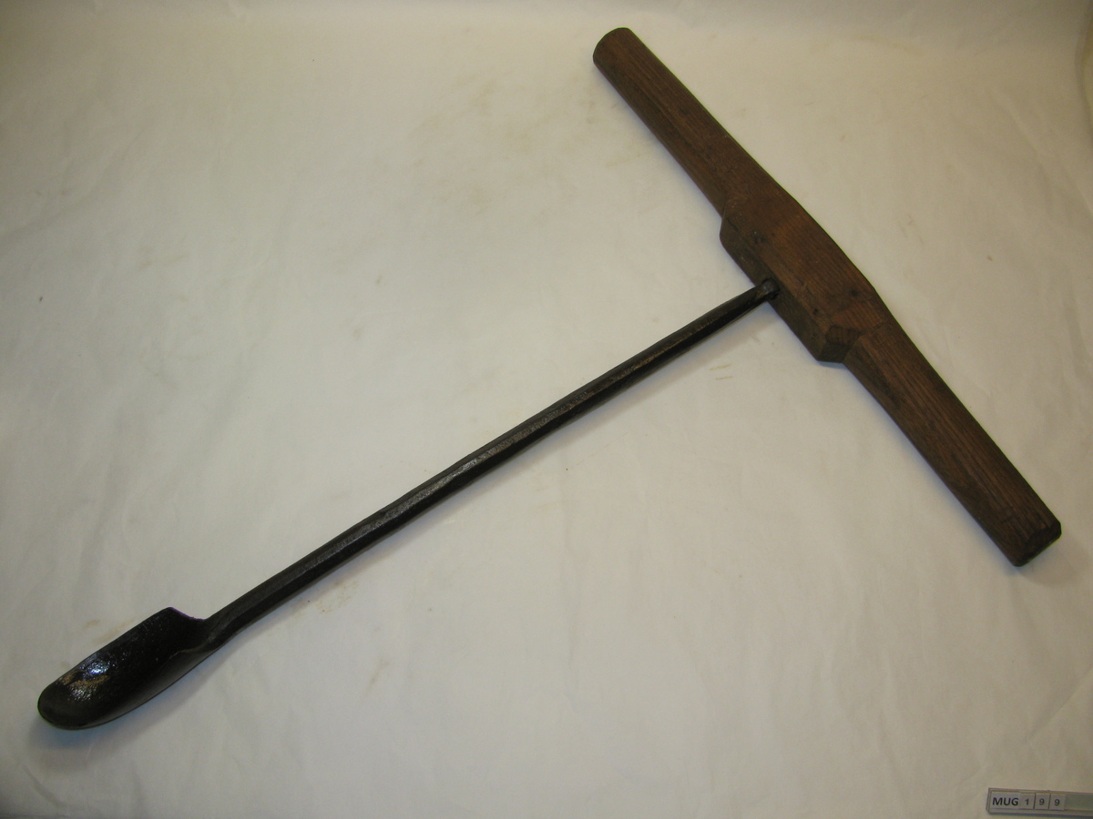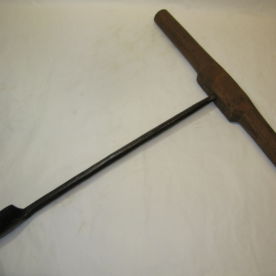 Hoekige ijzeren stang met zeer grote lepelboor en rond houten handvat. Zwart, bruin.
