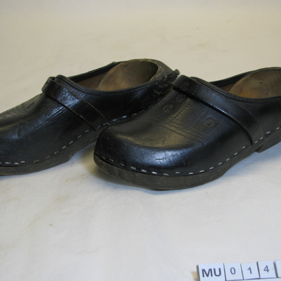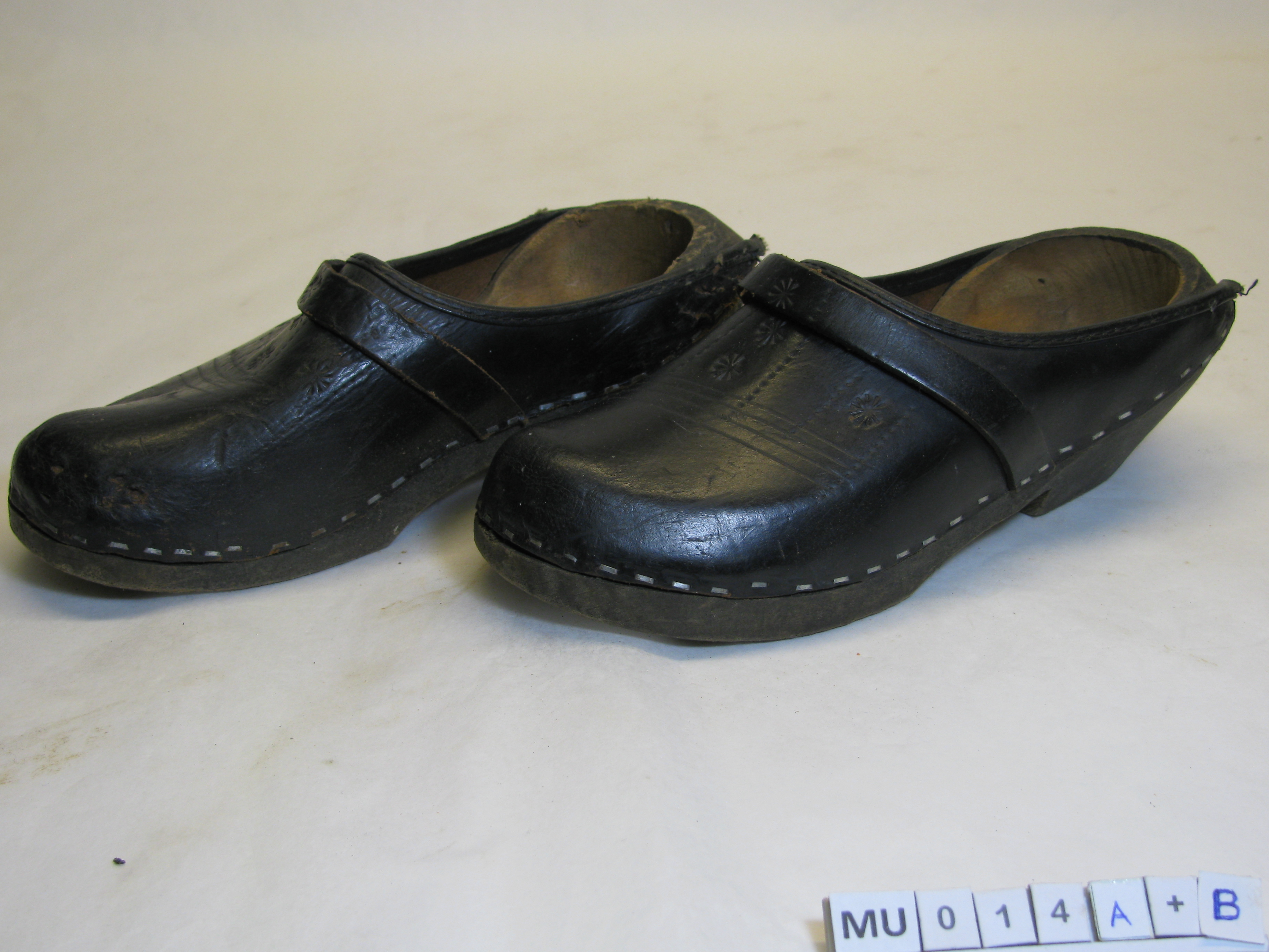 Houten zool met hoge hak en hiel. Leren bovenzijde die doorloopt tot houten hiel. Met smalle leren wreefriem. Op de kap gestanste versiering: strepen en 5 bloempjes. Zwart.
