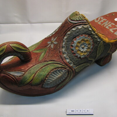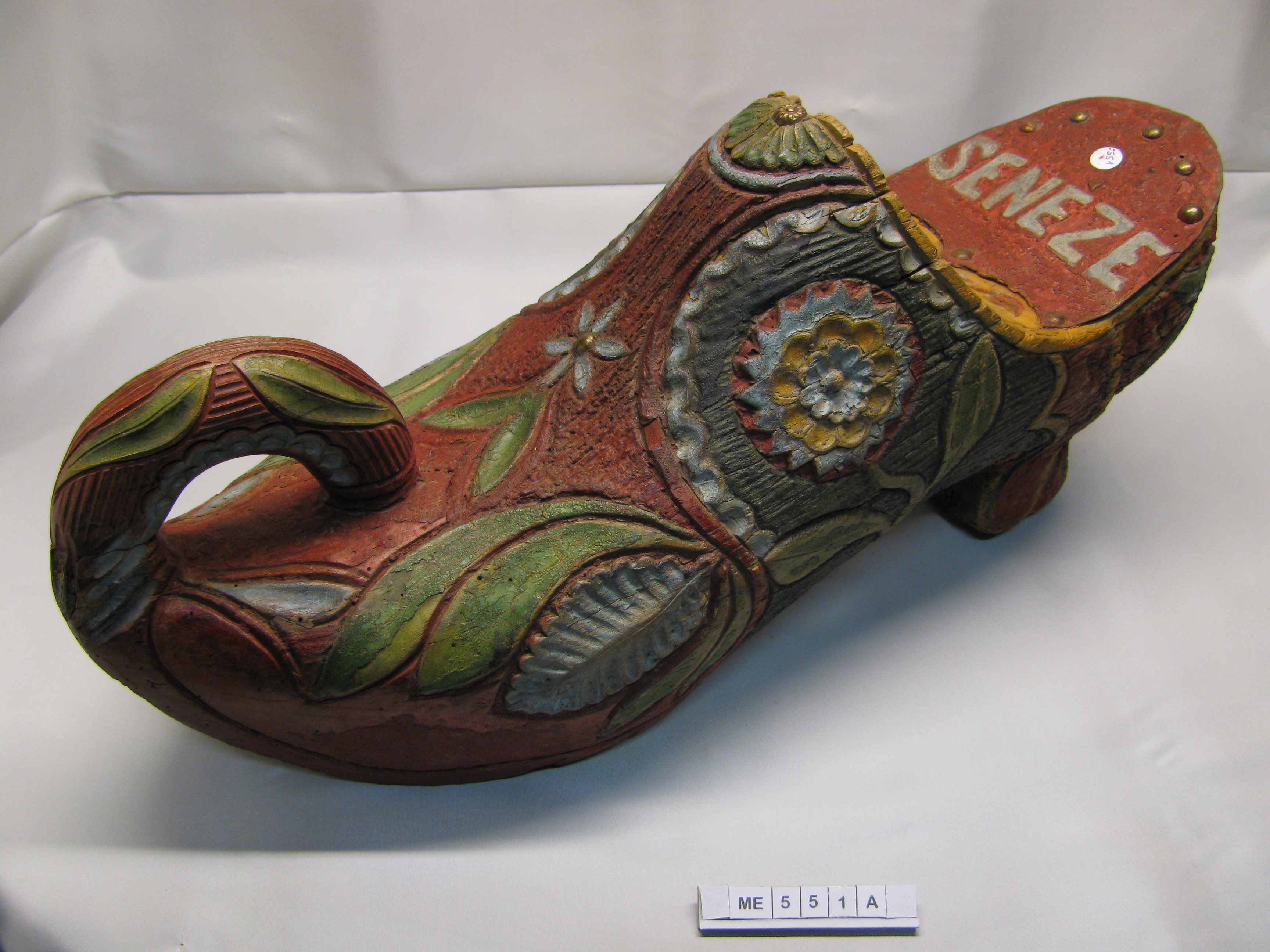 Uithangbord klomp voor binnen. Geheel bedekt met krul op de neus die er later is opgezet. Gegraveerd en kleur gegeven. Niet uitgehold. Hoge wreef. Hoge hak (verweerd). Blikken beschermplaat op binnenvoet. Metalen siernagel op top wreef. Tekst op hak: Seneze. 1888.