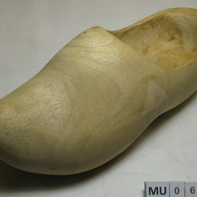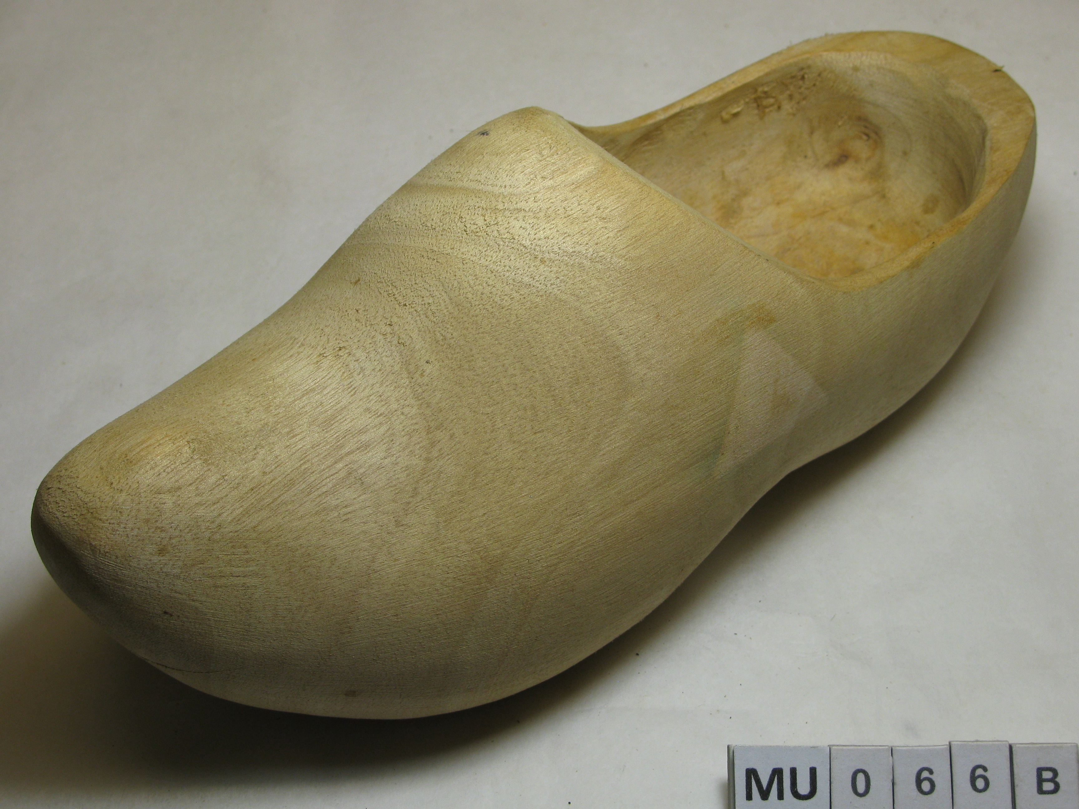 Bedekte kap met iets hoge wreef. Opgaande stompe neus doe op de kap naar beneden loopt. Lage hak. Neus niet volledig uitgehold. Blank.