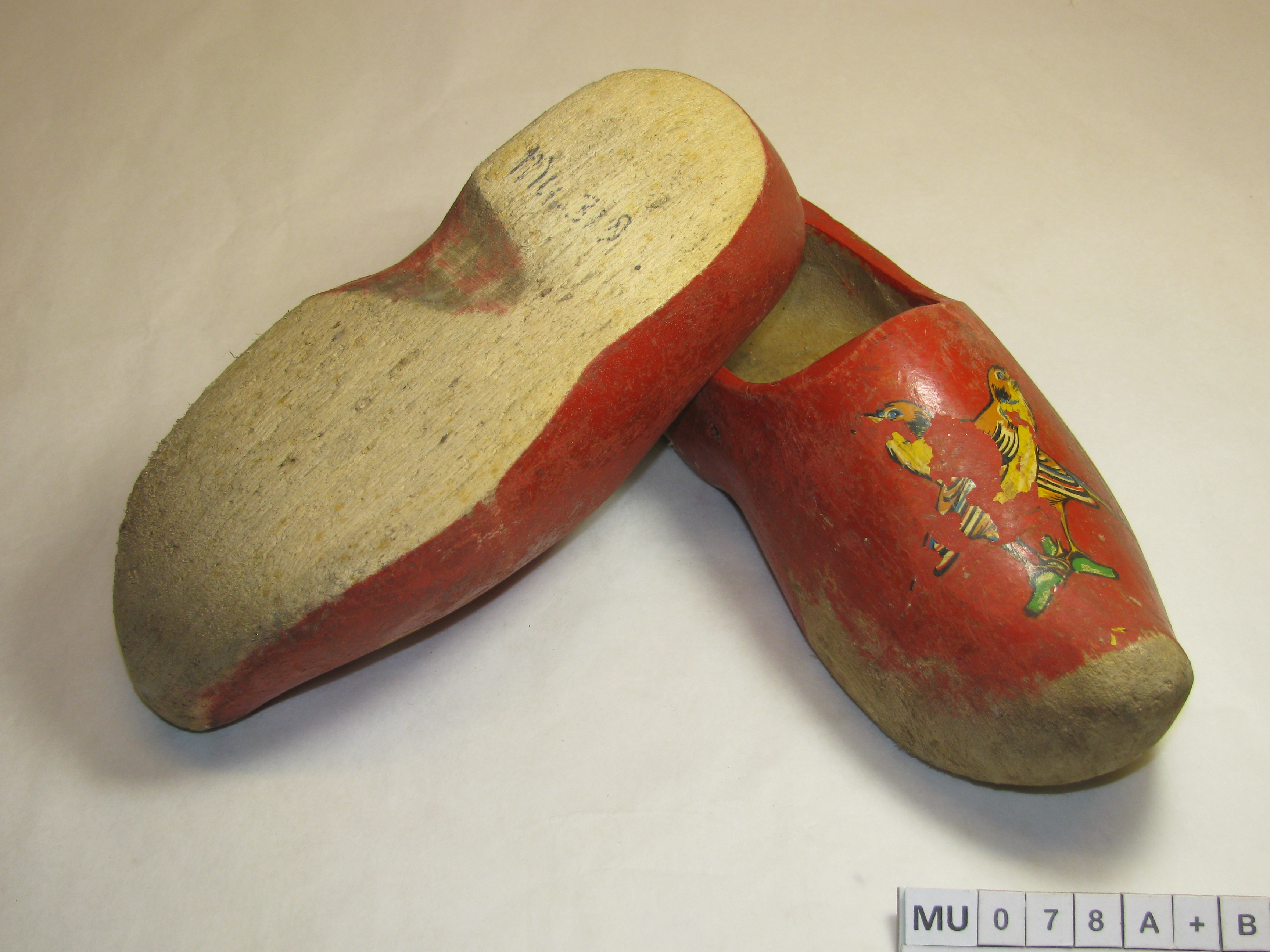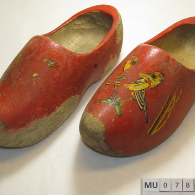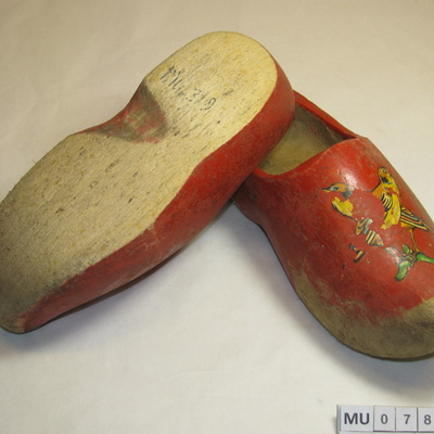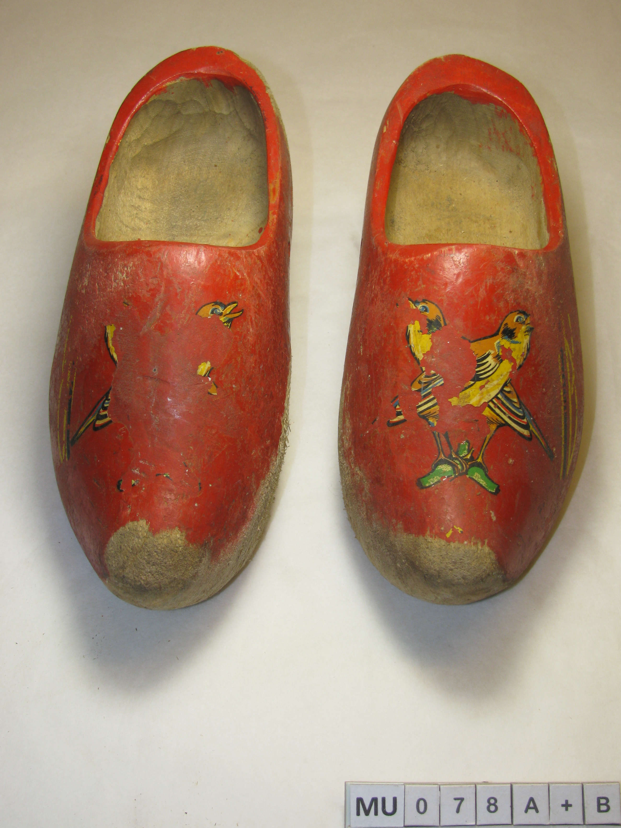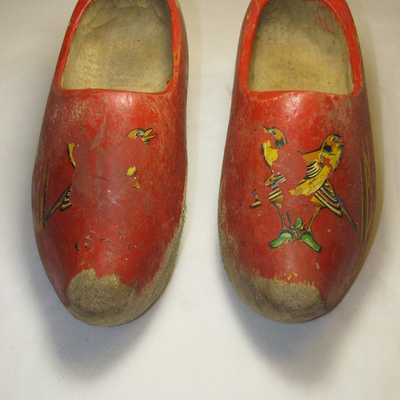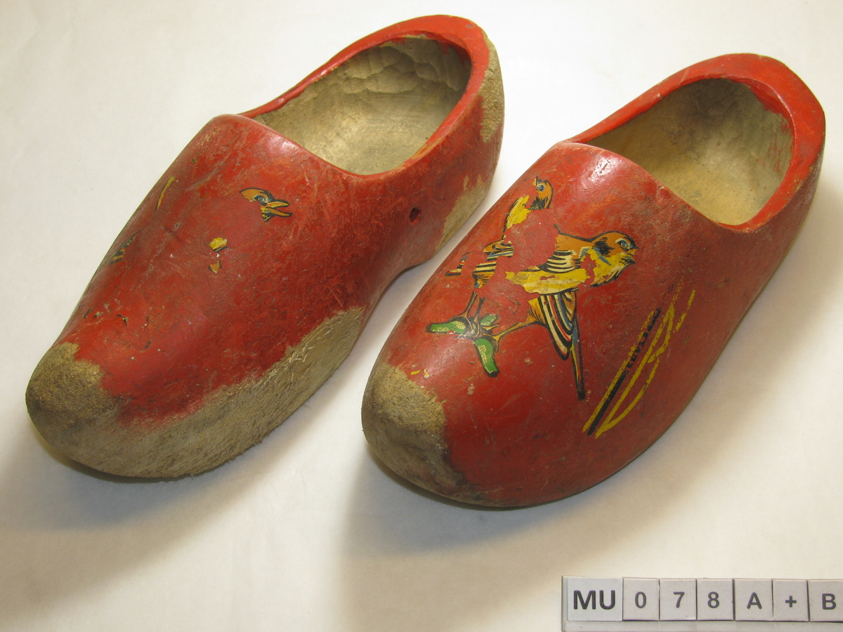 Kapklompjes met stompe afgesleten punt en afgesleten zool. Rood geverfd met streepversiering in zwart/geel. Centraal op de kap een plakplaatje van 2 vogels op tak (beschadigd). Rood, geel, zwart, groen.