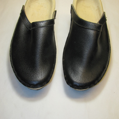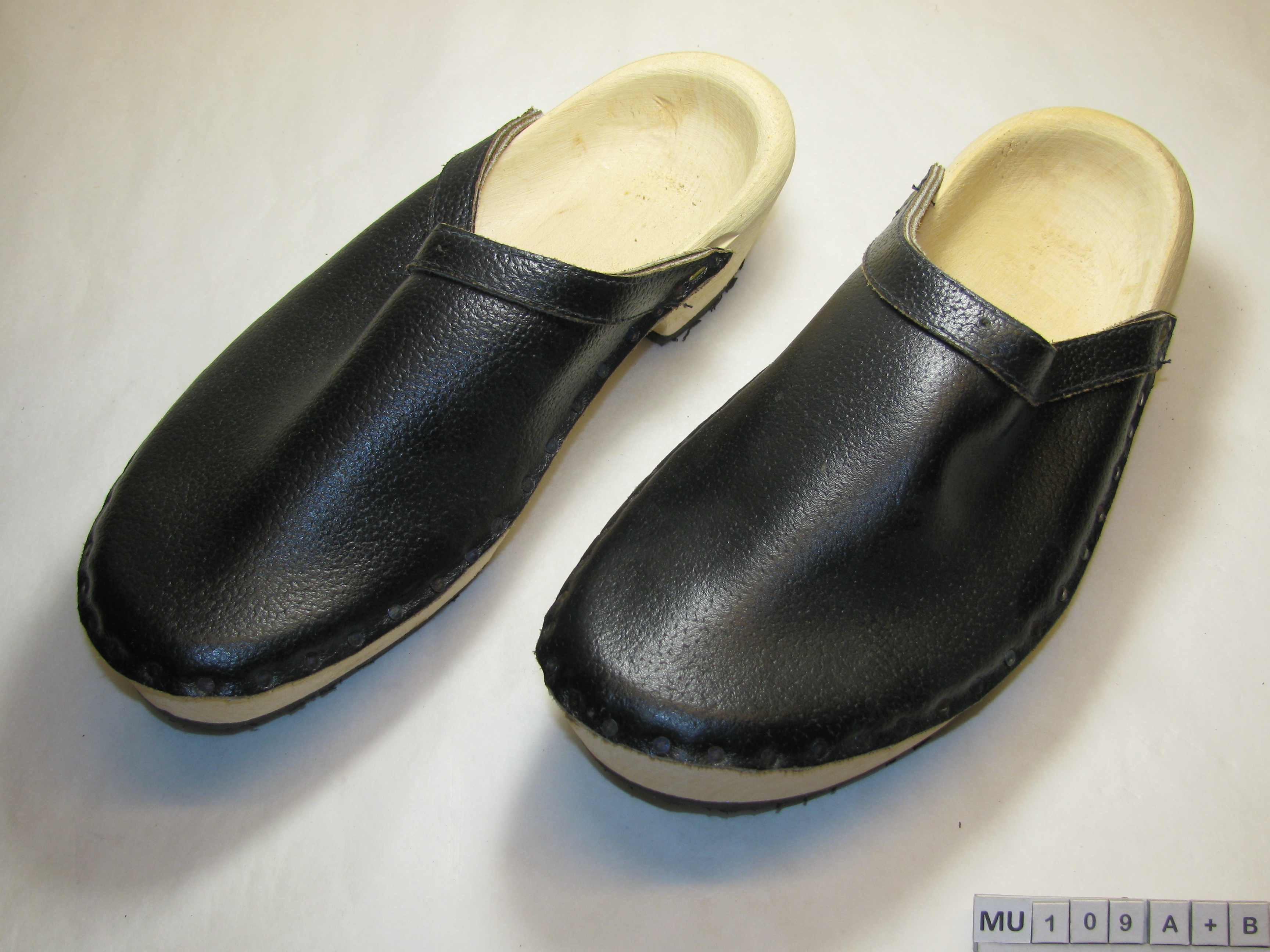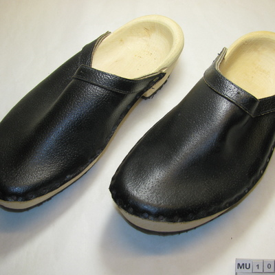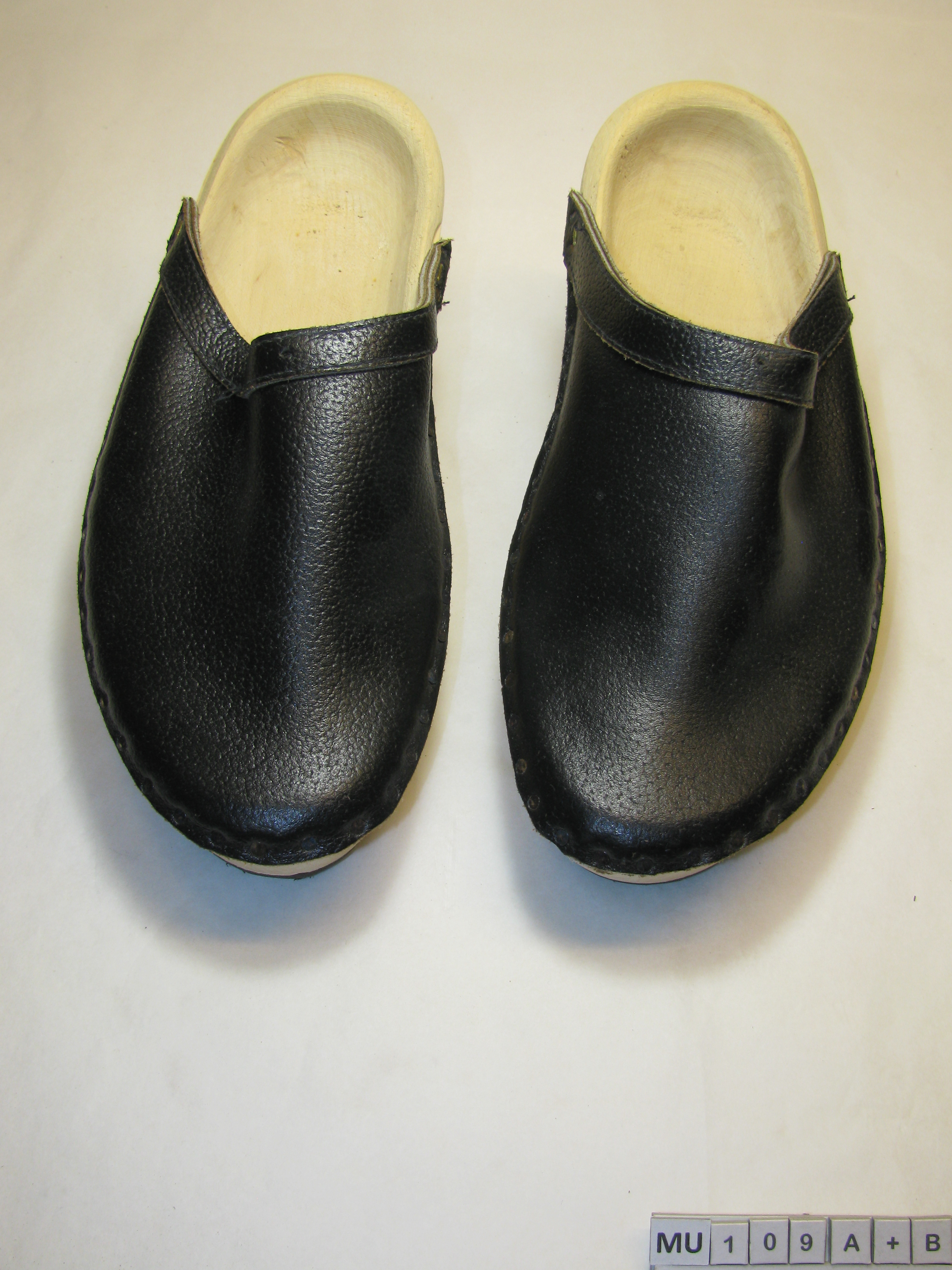 Schoenklompen met houten zool en hiel. Met hoge hak en ronde neus. Rubber zool onder voorvoet en hak. Leren kap met spijkertjes op hout bevestigd, met smalle wreefband langs de rand. Zwart, blank.