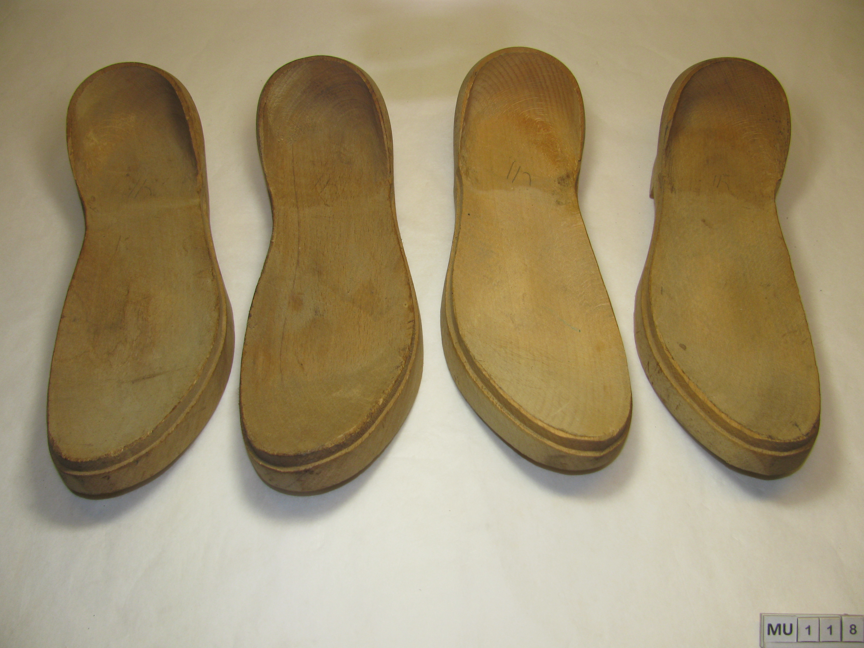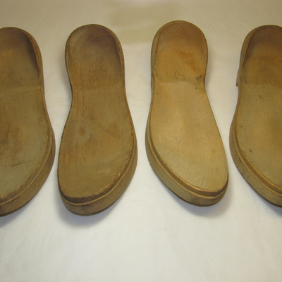 Schoenklompzolen, 2 paar, met voetbed. Iets opgaande neus, lage hak. Hiel schuin oplopend (rond van vorm), bovenaan weer schuin naar binnen lopend, bijna gehele voethak bedekkend. Rand uitgespaard om leer te bevestigen. Blank.