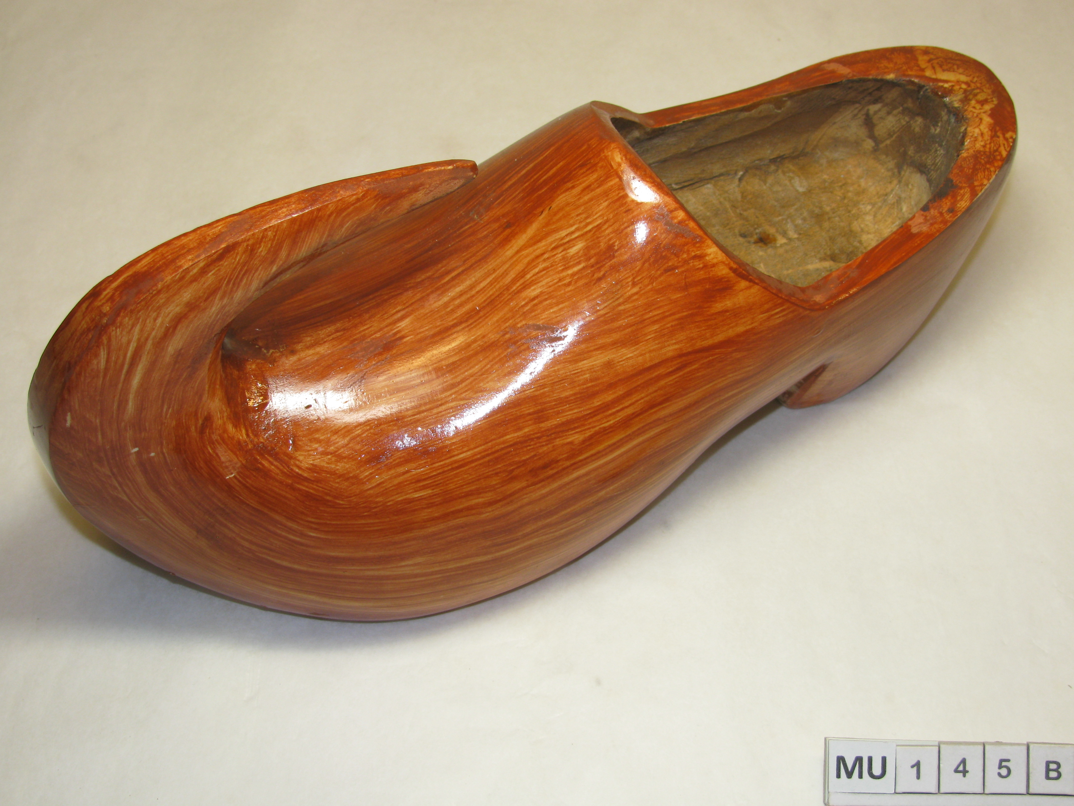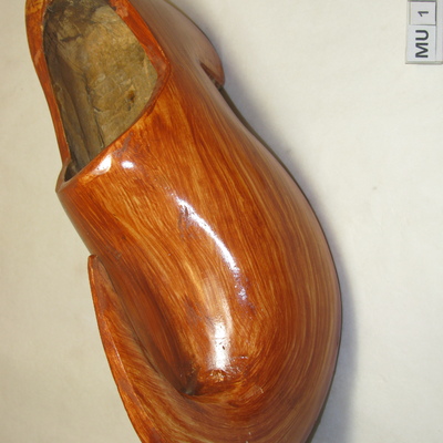 Kapklomp met sterk opgaande neus die in krul terug over de kap komt. Iets hoge wreef, halfhoge hak. Versiering door het verven in rood-bruine kleur. Rood, bruin, blank.