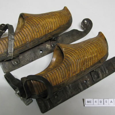 Schaatsklompen voor kinderen, ijzer - ruw gesmeed en klinknagels. Klompen met schaatsijzers eronder . Klomp bewerkt met ritswerk strepen. Iets opgaande spitse neus. Platte achterkant, leren enkelband met gespen. Bruin, zwarte zool simulatie.
