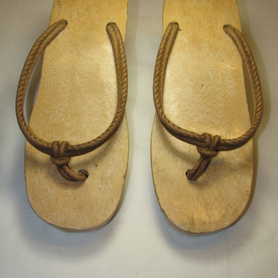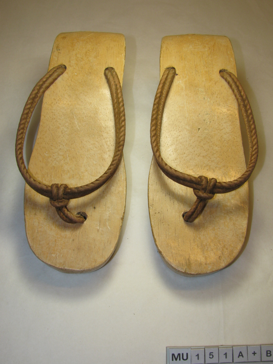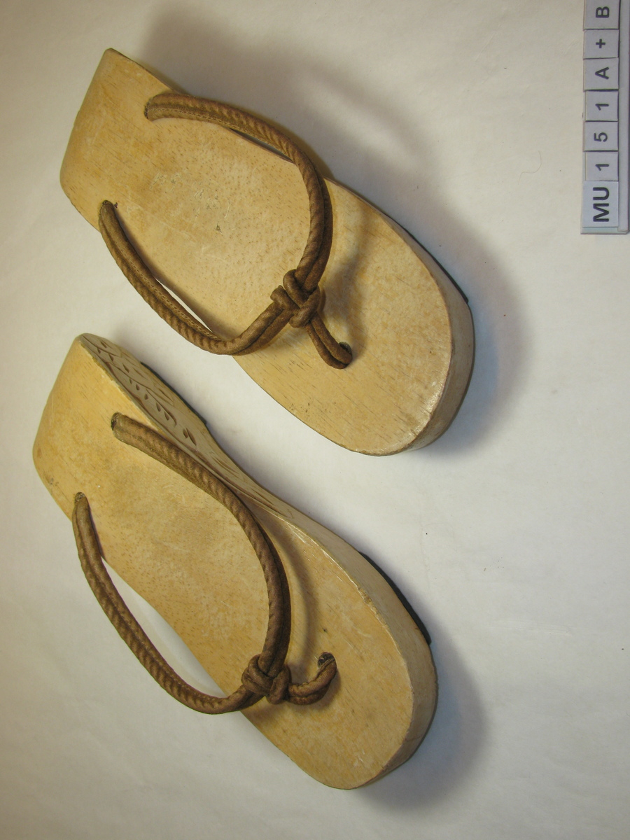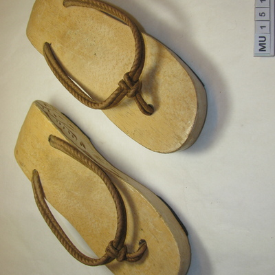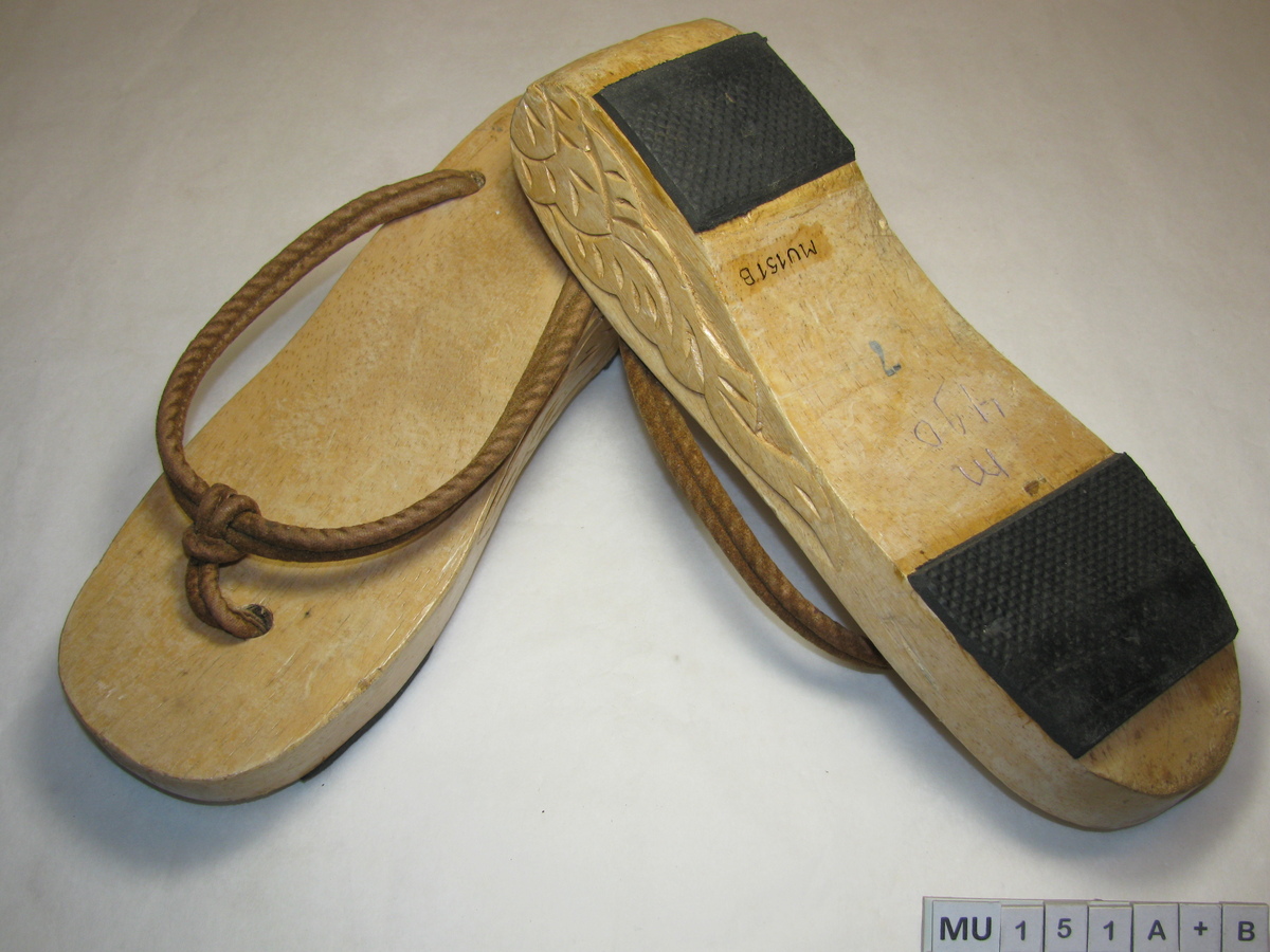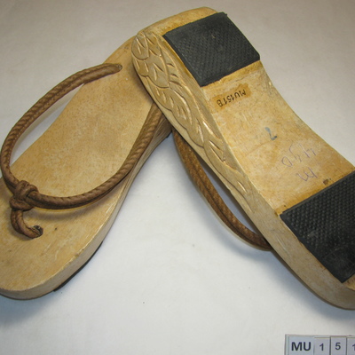 Houten zool met hogere achterkant. Met houtsnijwerk op de zij- en achterkant. Onder de zool 2 rubberstukjes (onder voorvoet en hak). In 3 gaten zijn bandjes vastgemaakt, midden voor en 2 links en rechts achter, voor bevestiging om de voet. Blank.