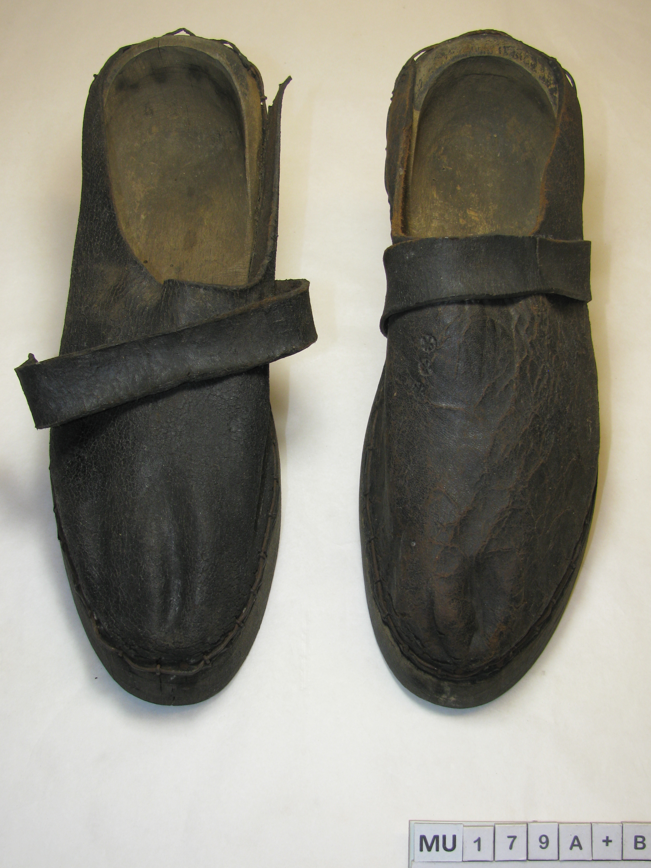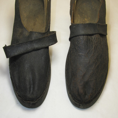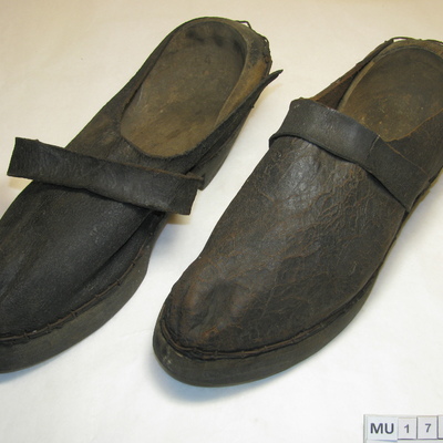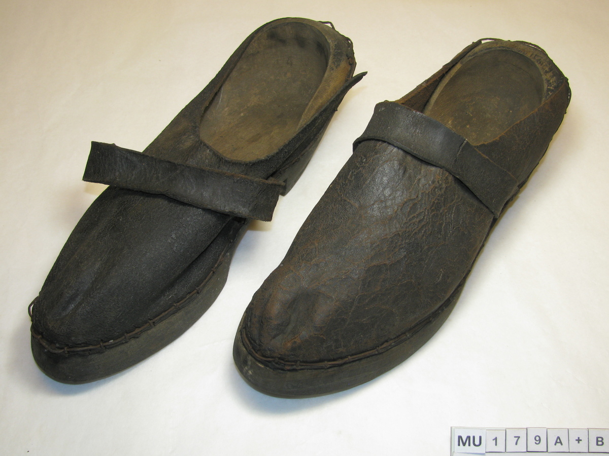 Houten zool waarvan het stuk tussen voorvoet en hak is weggesneden tot hakvorm. Hiel loopt in lichte kromming omhoog tot ronde vorm aan rand, hoge hiel. Leer in 1 stuk tot aan zijkanten van de hiel achteraan, vastgezet met spijkers/krammen en ijzerdraad hieronder. Met smalle leren wreefband. Machinaal gemaakt. Zwart, blank.