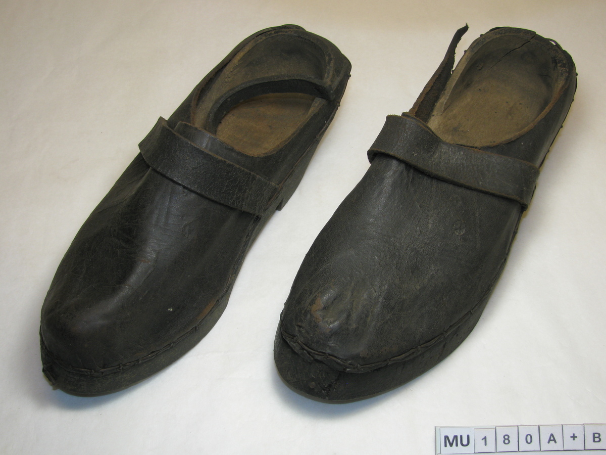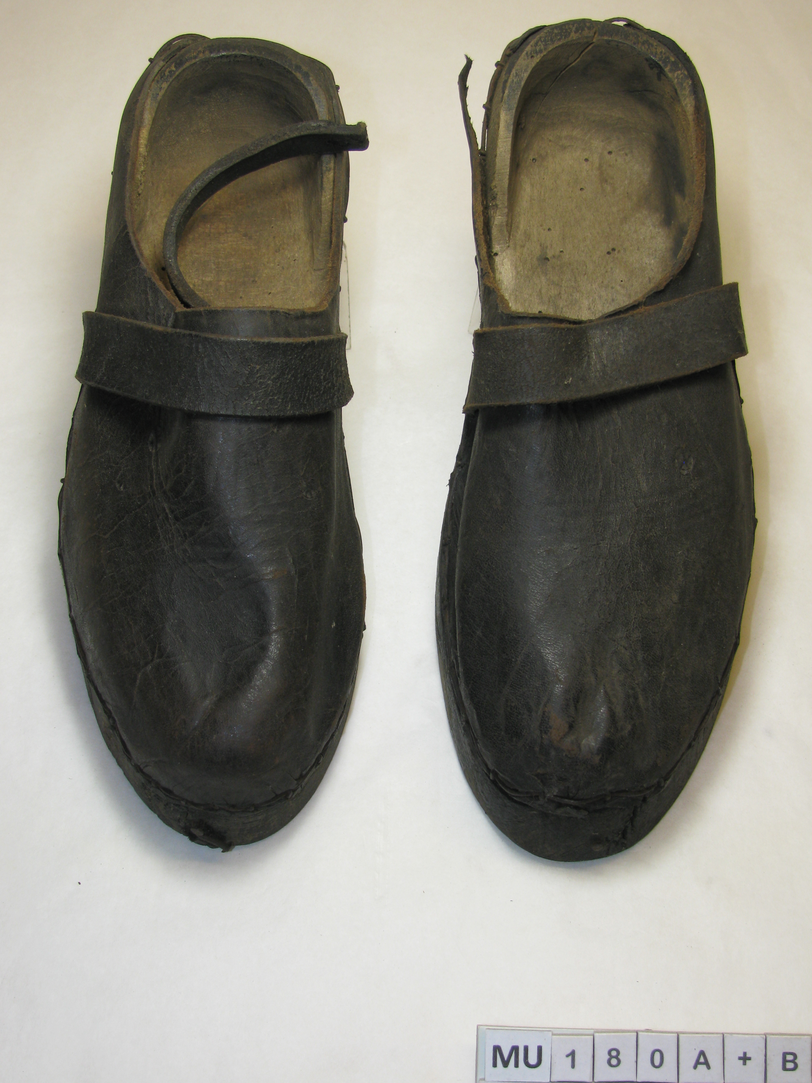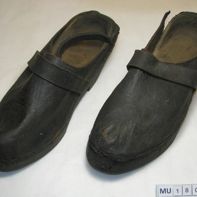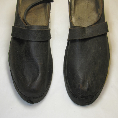 Houten zool met hak gemaakt door wgesnijden tussenstuk. Hiel loopt met kromming omhoog tot ronde hiel achterrand. Hoge hiel. Leer in 1 stuk tot aan de zijkanten van de hiel achteraan, vastgezet met krammen waaronder ijzerdraad loopt. Smalle leren wreefband. Leren bandje voor op neus om paar bijeen te houden. Machinaal gemaakt. Neus loopt schuin omhoog. Zwart, blank.