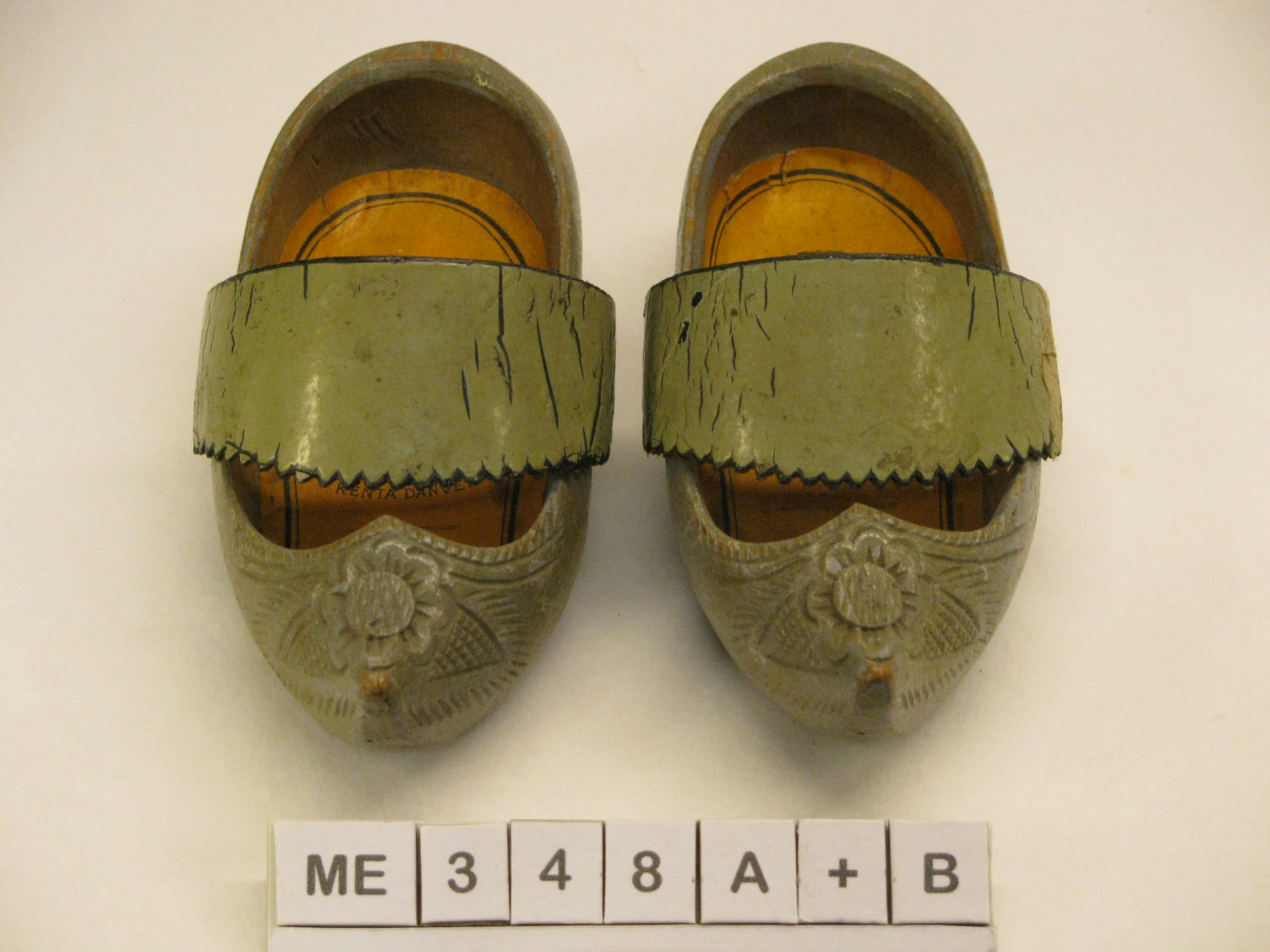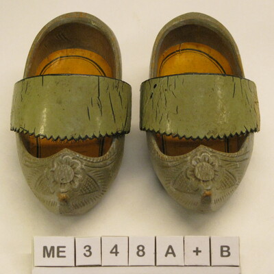 Modelklompen (kinderklompen). Een kwart bedekt . Spitse iets opgaande neus. Brede leren wreefband met kartelrand. Op kap graveerwerk van bloem en ruitblad en rand. Spitse punt. Etiket op binnenzool. Kenta Danvez - Au Biniou - Breton