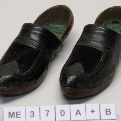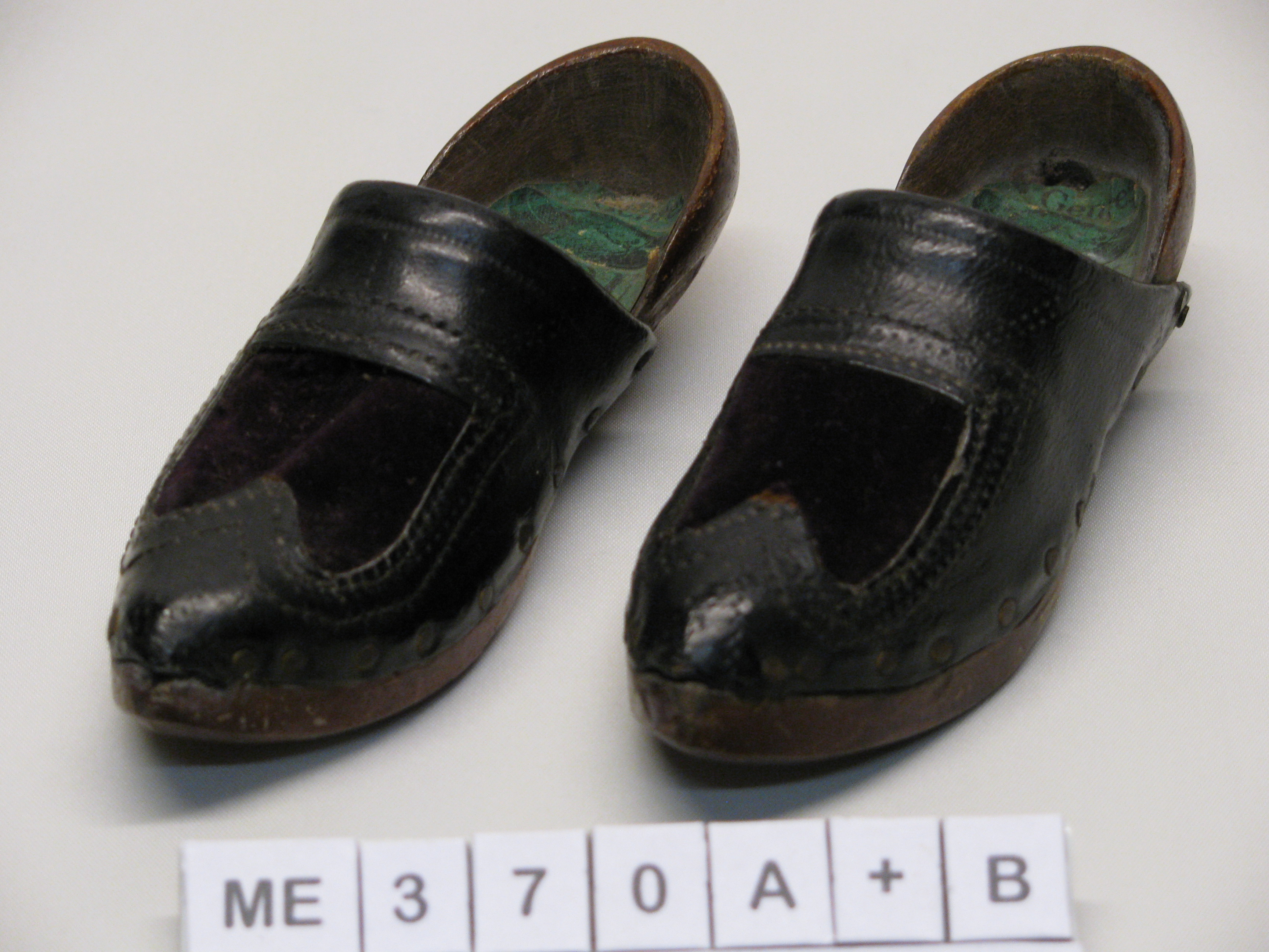 Souvenirklompen, galoches. Zeer klein met houten hiel en leren kap met velours erop en stiksel nadel met hak.. Etiket met tekst: Genres Dupuy, Aigurande - Indre (plaats+provincie).