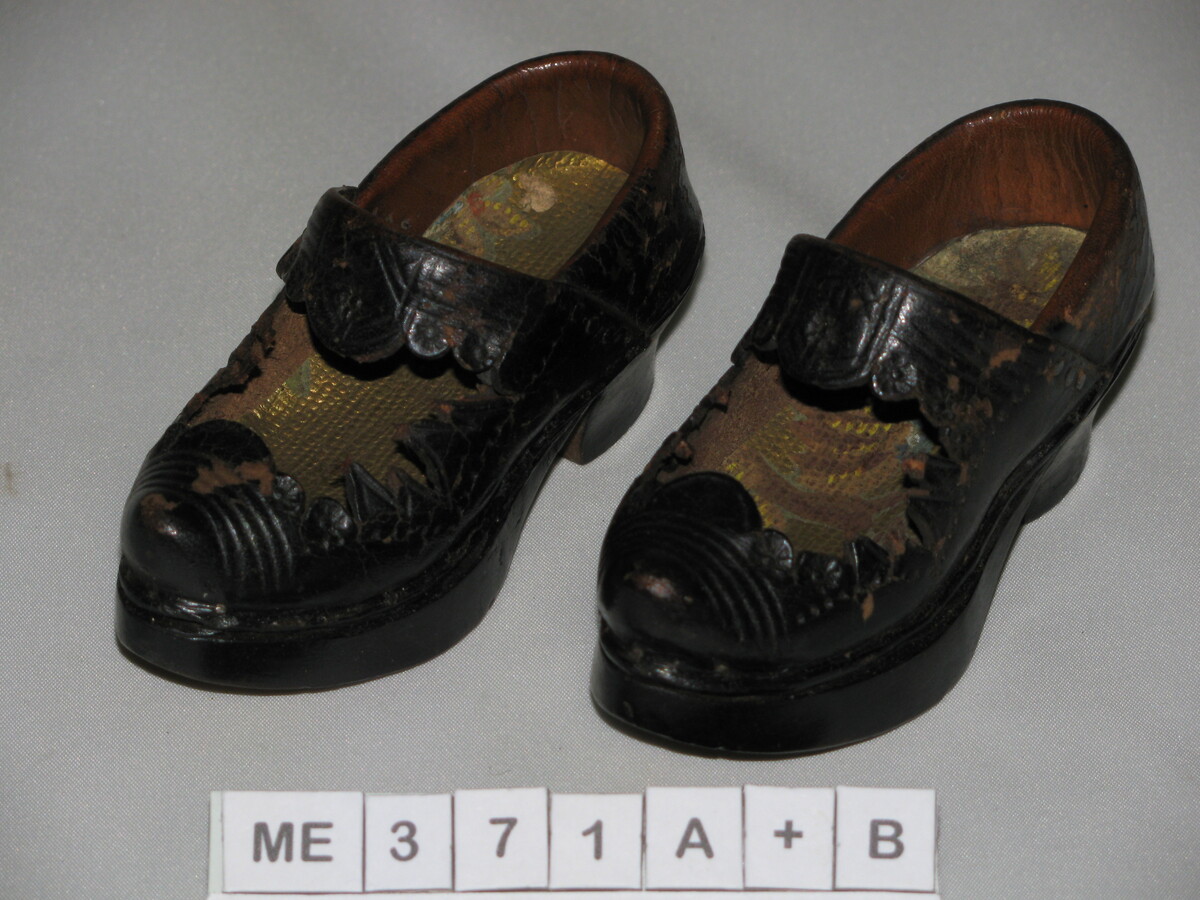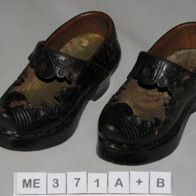 Modelklomp (miniatuurklompen). Galoche in miniatuur model. Hoog model, open gewerkt leer. Hoge hak. Binnenzooltjes leer (of papier) met polychroom, goud, bloemen. Puntjes neus. Hoge hiel. Leer op kap gestanste versiering. Binnenzijde hiel extra leer naar binnen gevouwen. Zwart gelakt. Goud - rood - groen.