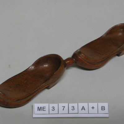 Modelklompen (miniatuurklompen). Galoche zool van aangeving van een galoche model. Miniatuur. Met opgaande hiel en hak. Aan elkaar gelaten bij punt/hiel. Tekst eronder: Prix dans la masse Auzelle. Sabotier Estaux les Baux la creuse.