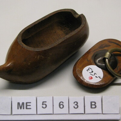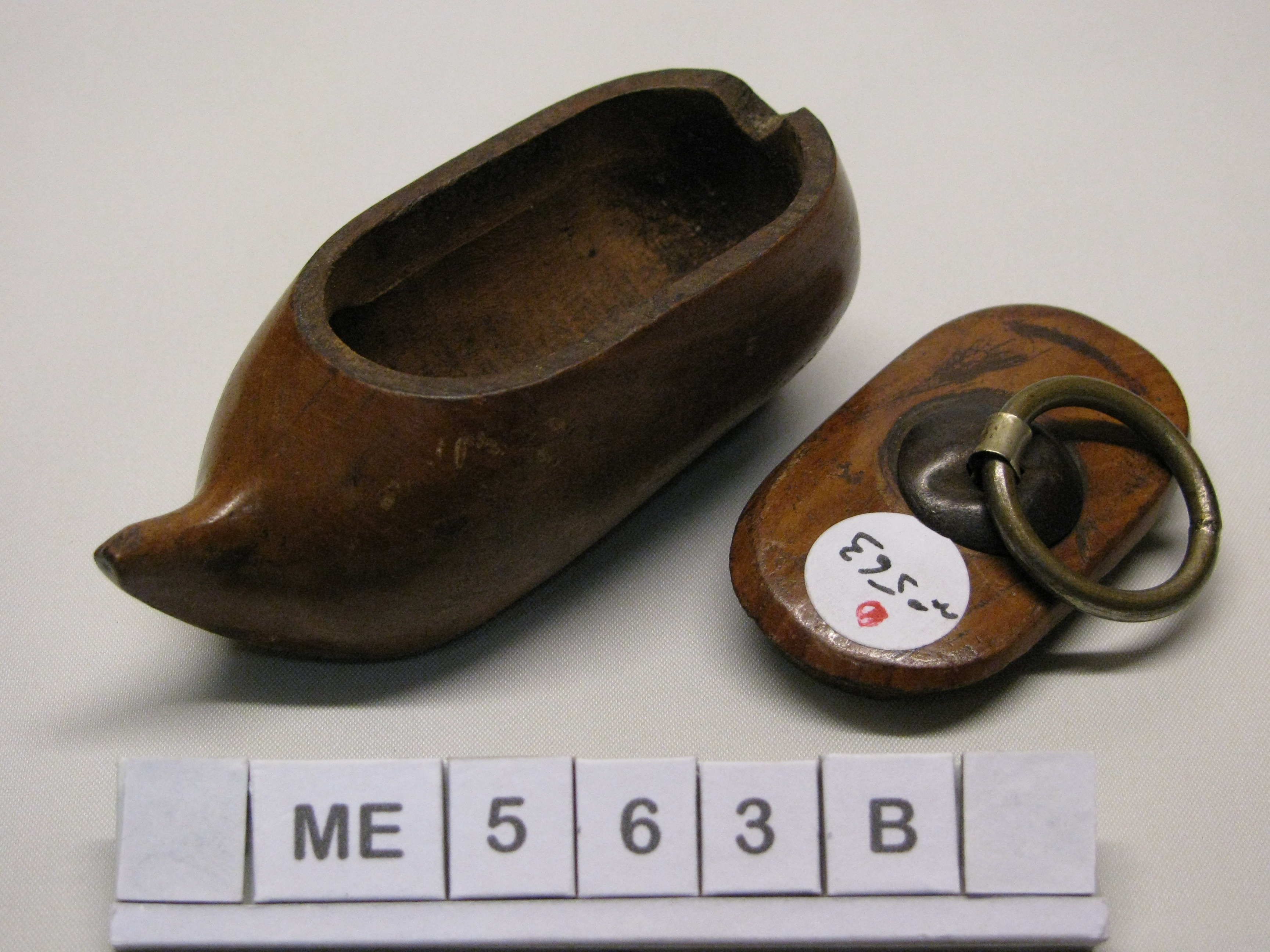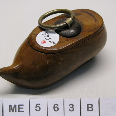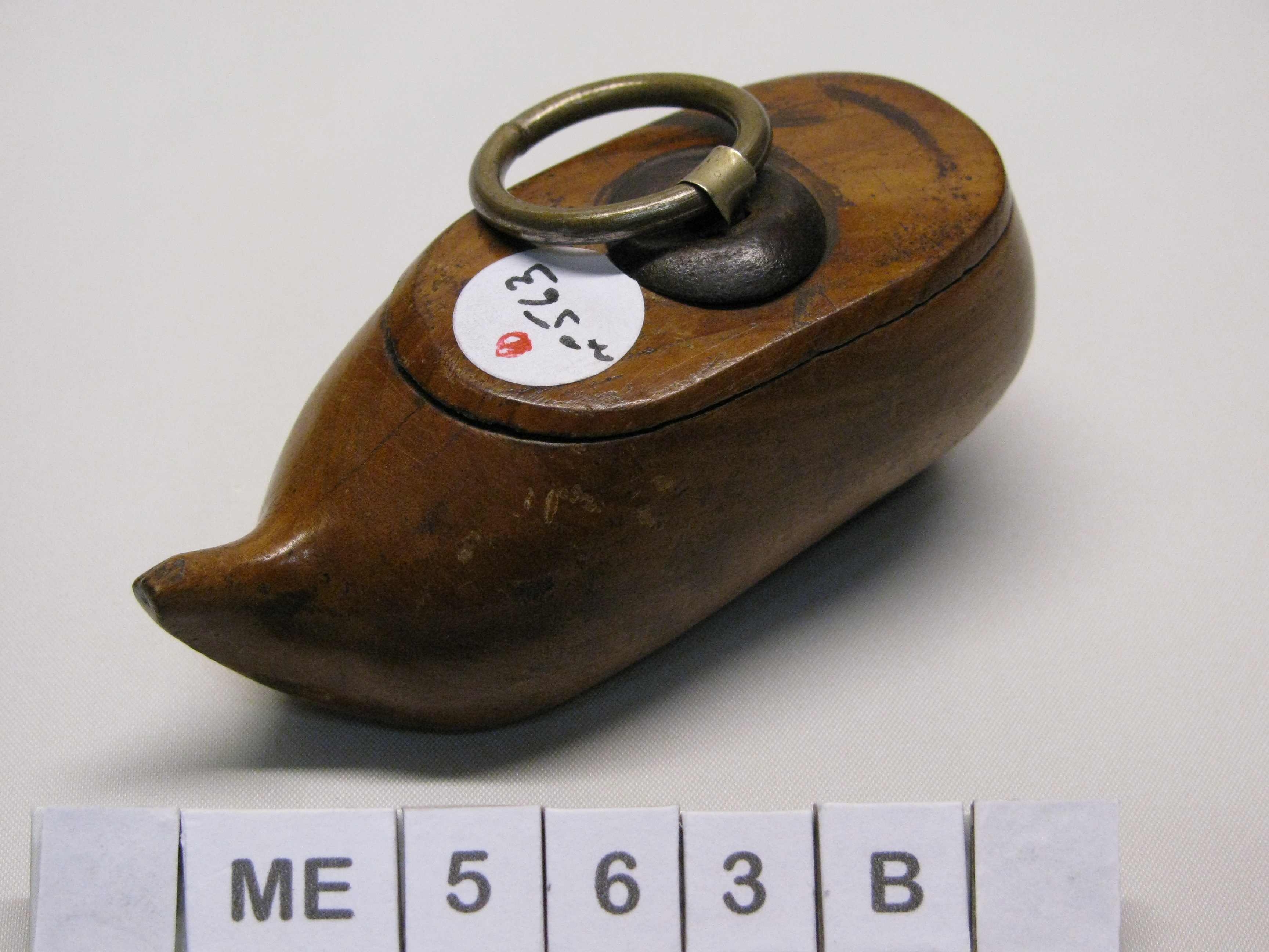 Tabatiere (snuifdoos). Klein klompje. Bedekt met puntvormige opgaande punt. Deksel met messing ring. Bedoeld als snuifdoos. Met hak. Blankt gelakt. Palm- of Buxushout.