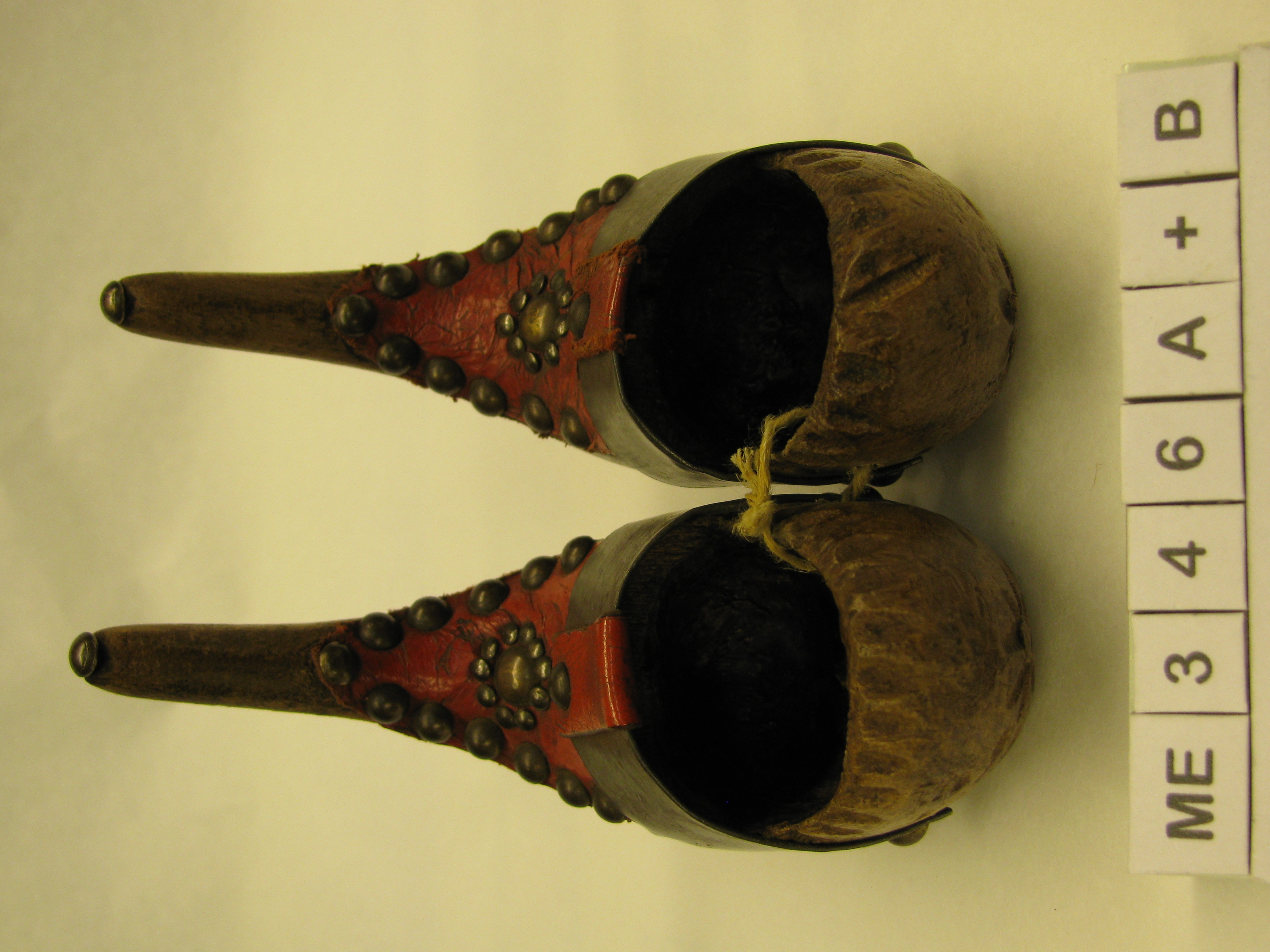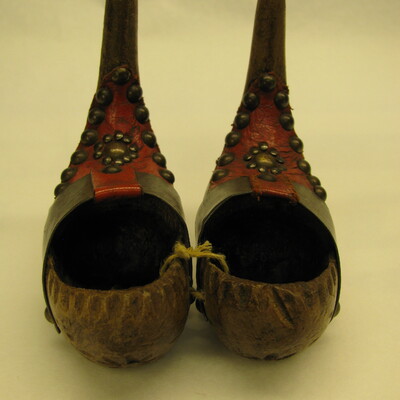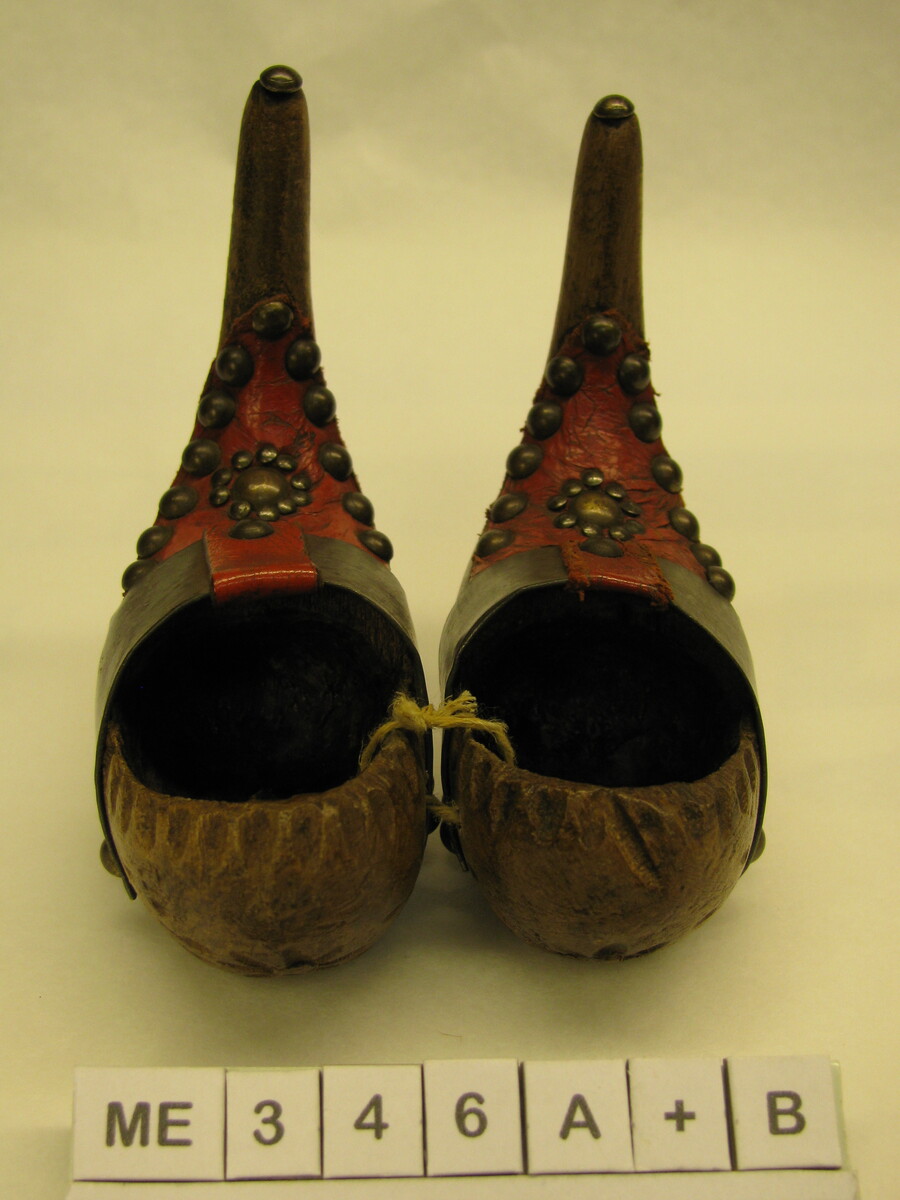 Modelklompen, half bedekt. Spitse zeer opgaande neus. "Bethmale". Op de kap bedekt met rood leer. IJzeren wreefband, nagels langs rand v/d kap en als bloem middenop. Snijwerk van bloem aan de achterkant v/d neus en lobjes langs zool + hielrand. Blank gelakt, rood leer.