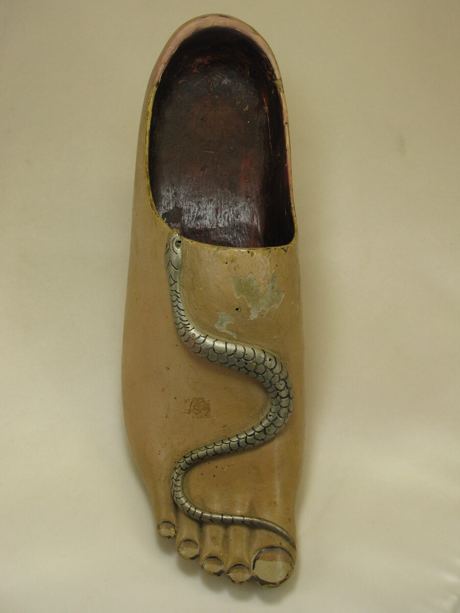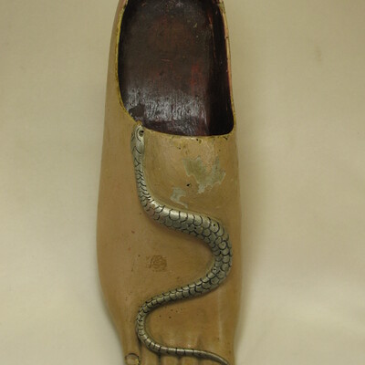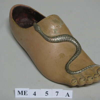 Sierklomp, polychroom, in vorm van voet. Kap met snijwerk +polychroom van blote tenen en slang op kap. Gedragen. Roze, zwart, zilver, donkerrood.