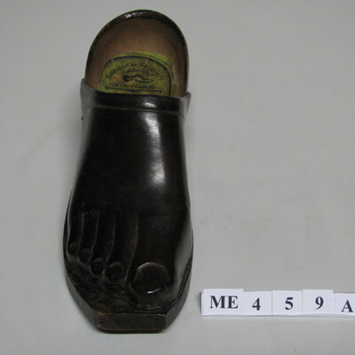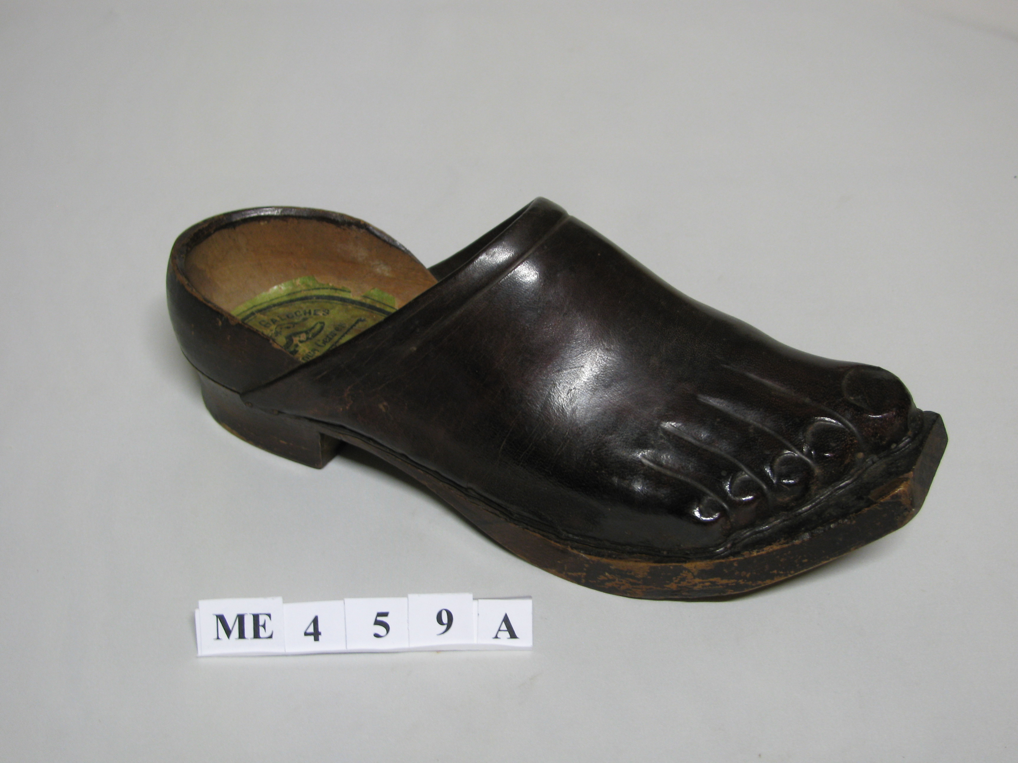 Sierklompen, galoche man. Houten zool + hak. Leren kap met stans van blote tenen. Met hak, leer vastgezet met spijkers. Zool uitstekend naast leer bij teen. Bruin gelakte houten zol, bruin leer.