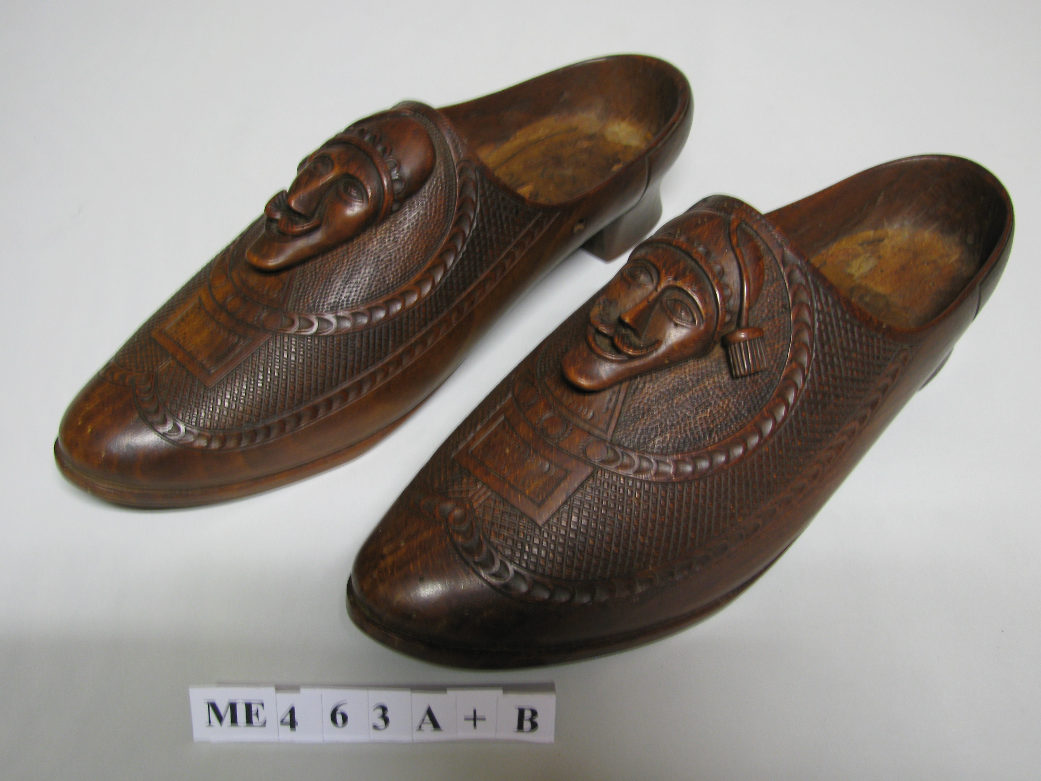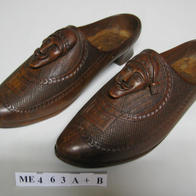 Sierklomp, mannen. Houtsnijwerk met mannengezicht met muts met kwast en snor. Schoen simulatie, ruit stipen, randen zool. Met hak. Fabrique de Sabots et Galoches de Tours Genres Quentin 38 Rue de la Forer Fougeres Ville de Vilaine.