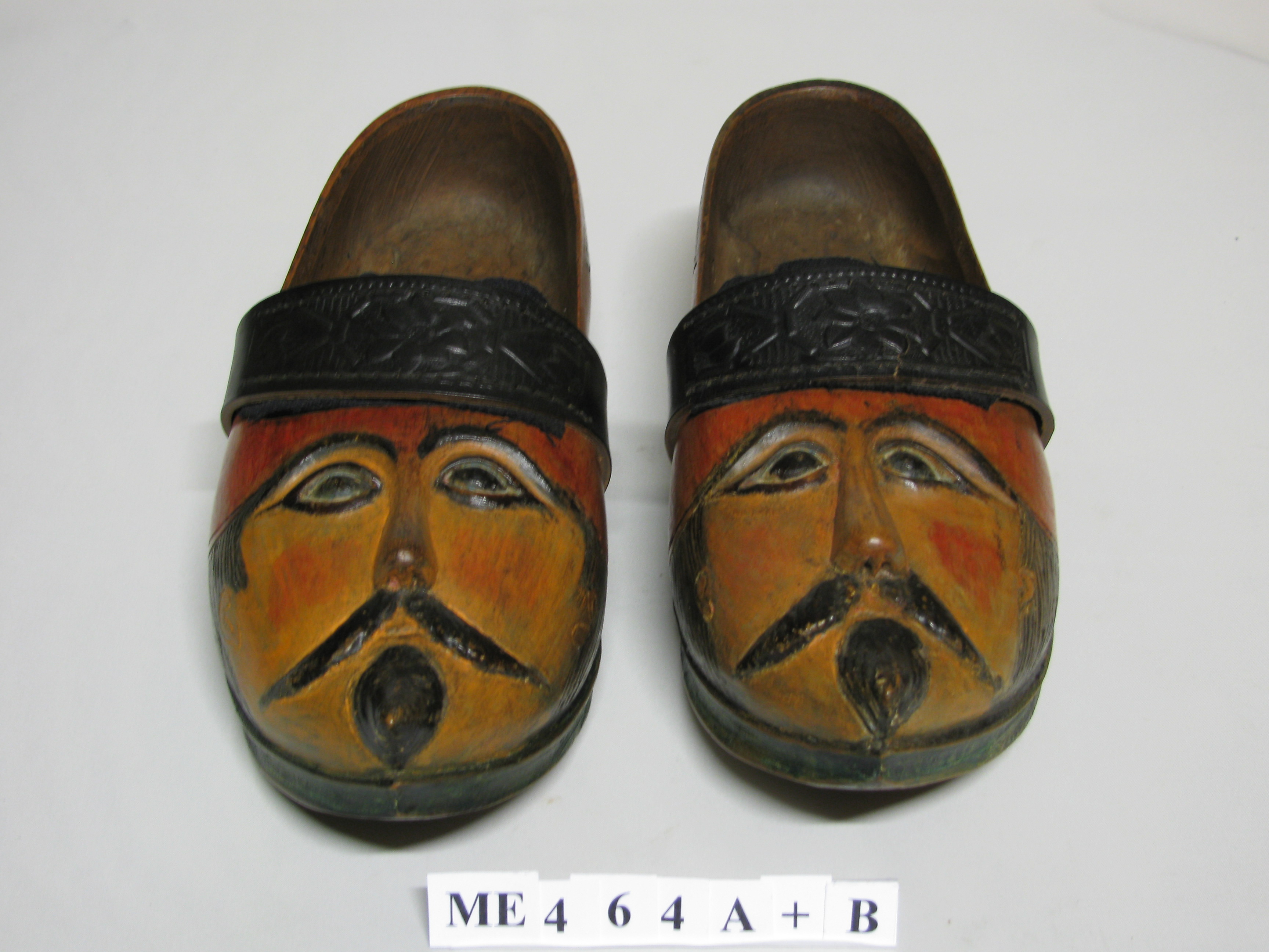 Sierklomp, mannen, polychroom. Halfbedekt met mannengezicht met baard (spitse punt). Hak, hiel houtsnijwerk van bladeren, groen, rood. Textiel onder band - Band bewerkt met bloem. Zool simulatie. Licht gedragen.