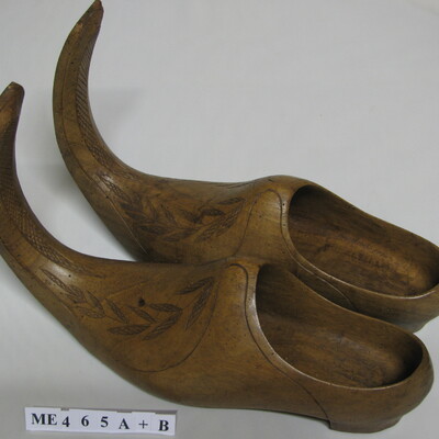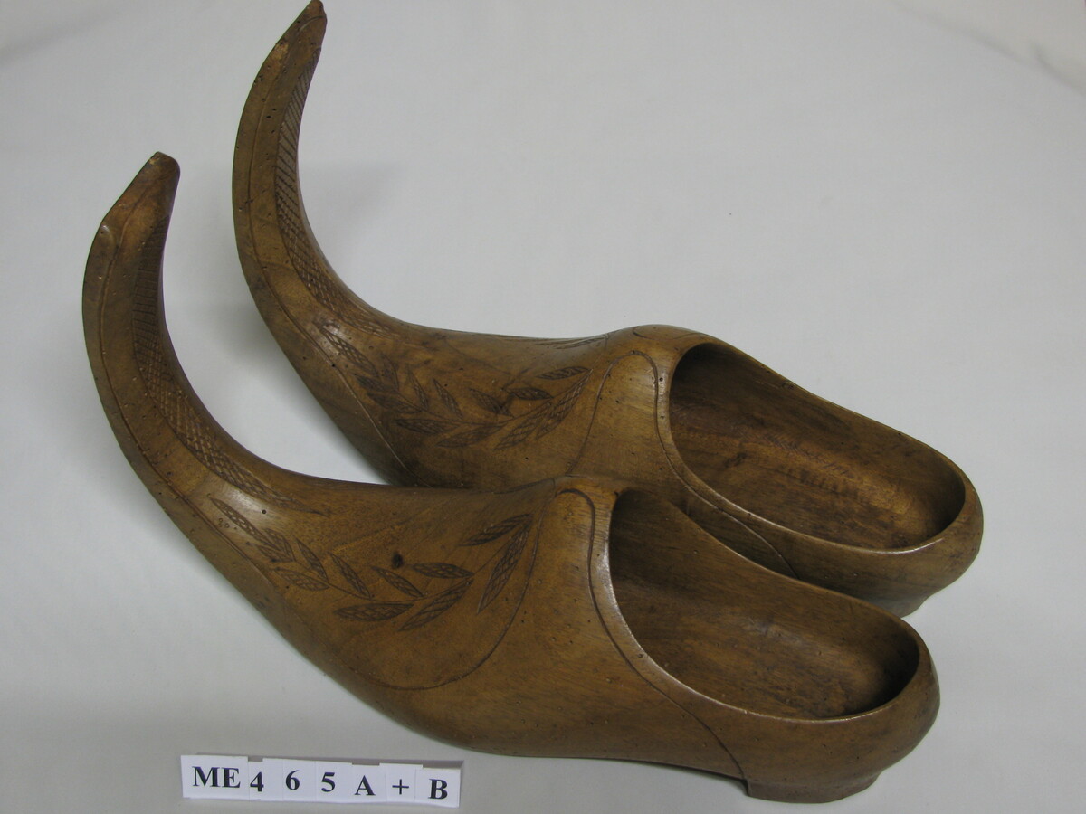 Sierklomp, mannen. Met sterk opgaande brede neus en ritswerk van bladeren en ruit en sierlijn. Met hak en hoge wreef. Blank gelakt.
