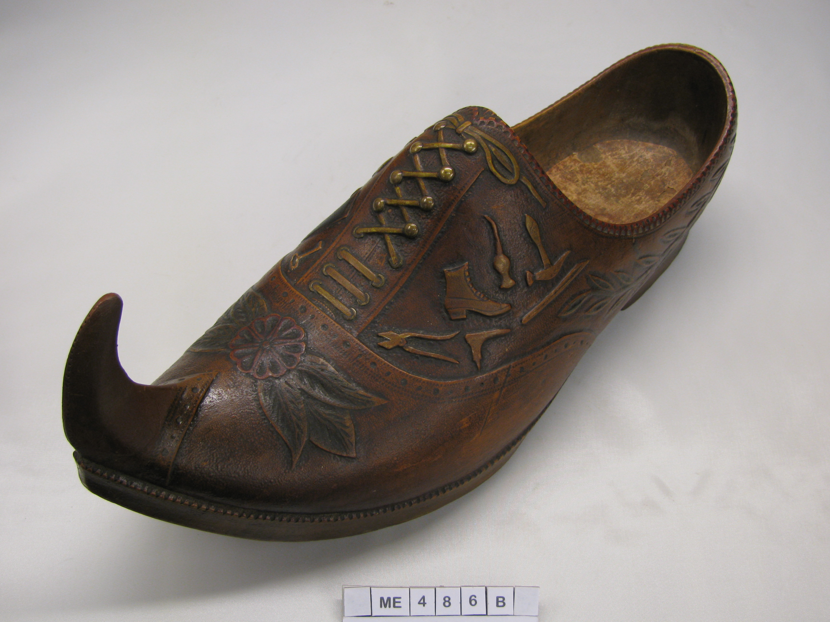 Uithangbord klomp voor binnen, heren model. Bedekt, met hoge wreef. Schoen model met versiering van veters leer imitatie, gereedschap (schoenmaker) en schoenen. Bloem motief. Zijkant takken met bladeren. Hoge opgaande punt neus, zool imitatie, met hak. Tekst op zool N. Roblin. Etiket onleesbaar.