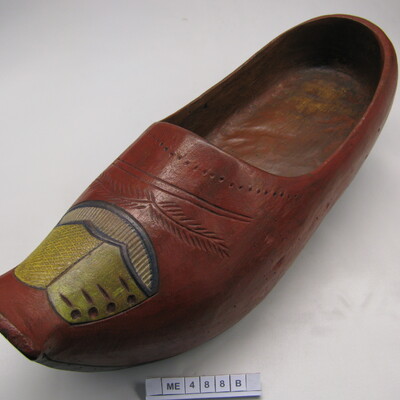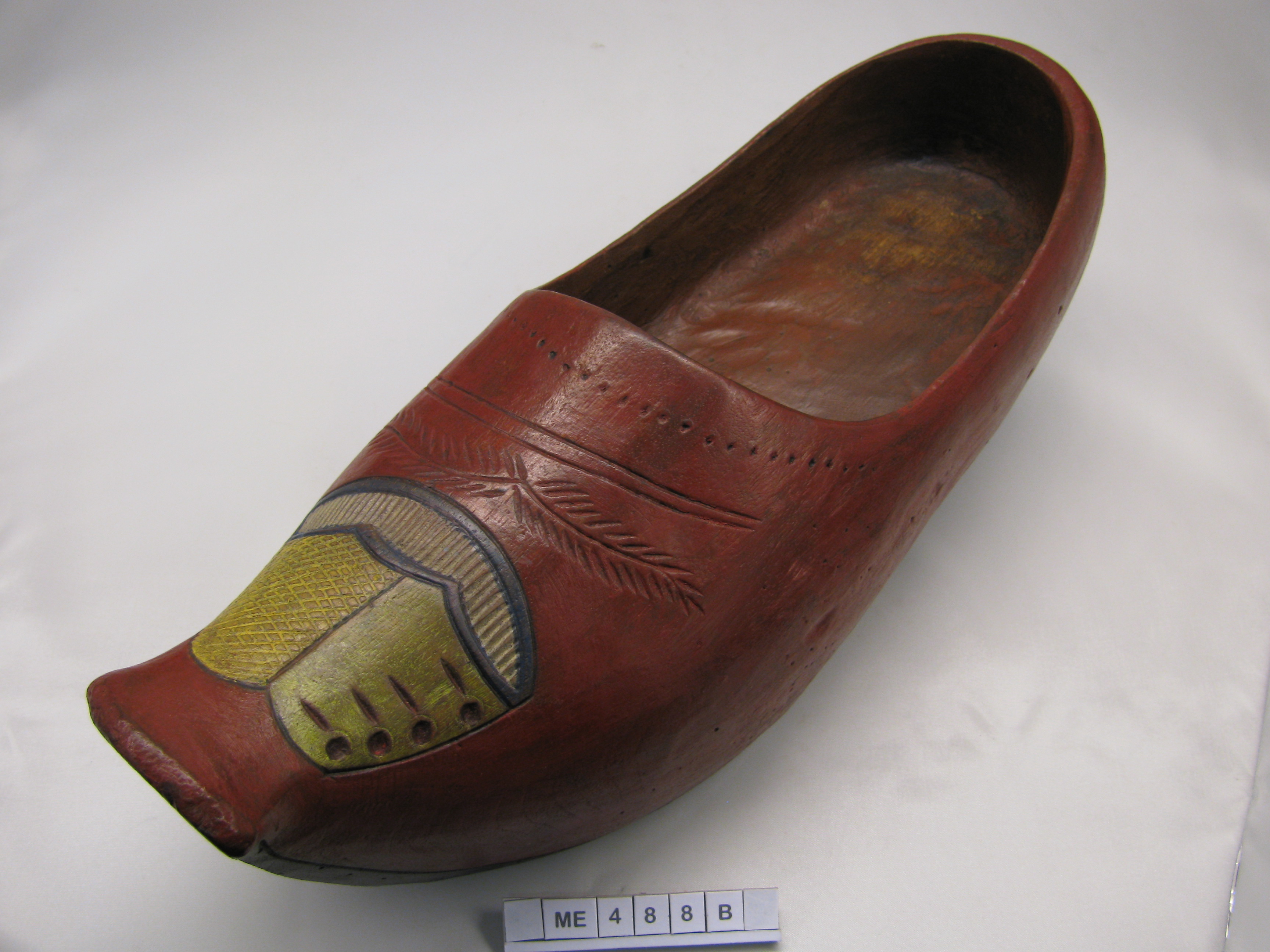 Uithangbord klomp, heren model. Gedekt. Ritswerk ingekleurd op kap met figuur met ruitjes, streepjes en knoopjes. Blad simulatie en stippelrand. Brede opgaande neus. Hoge hiel, met hak. Zool erg beschadigd + zijkant. Polychroom.