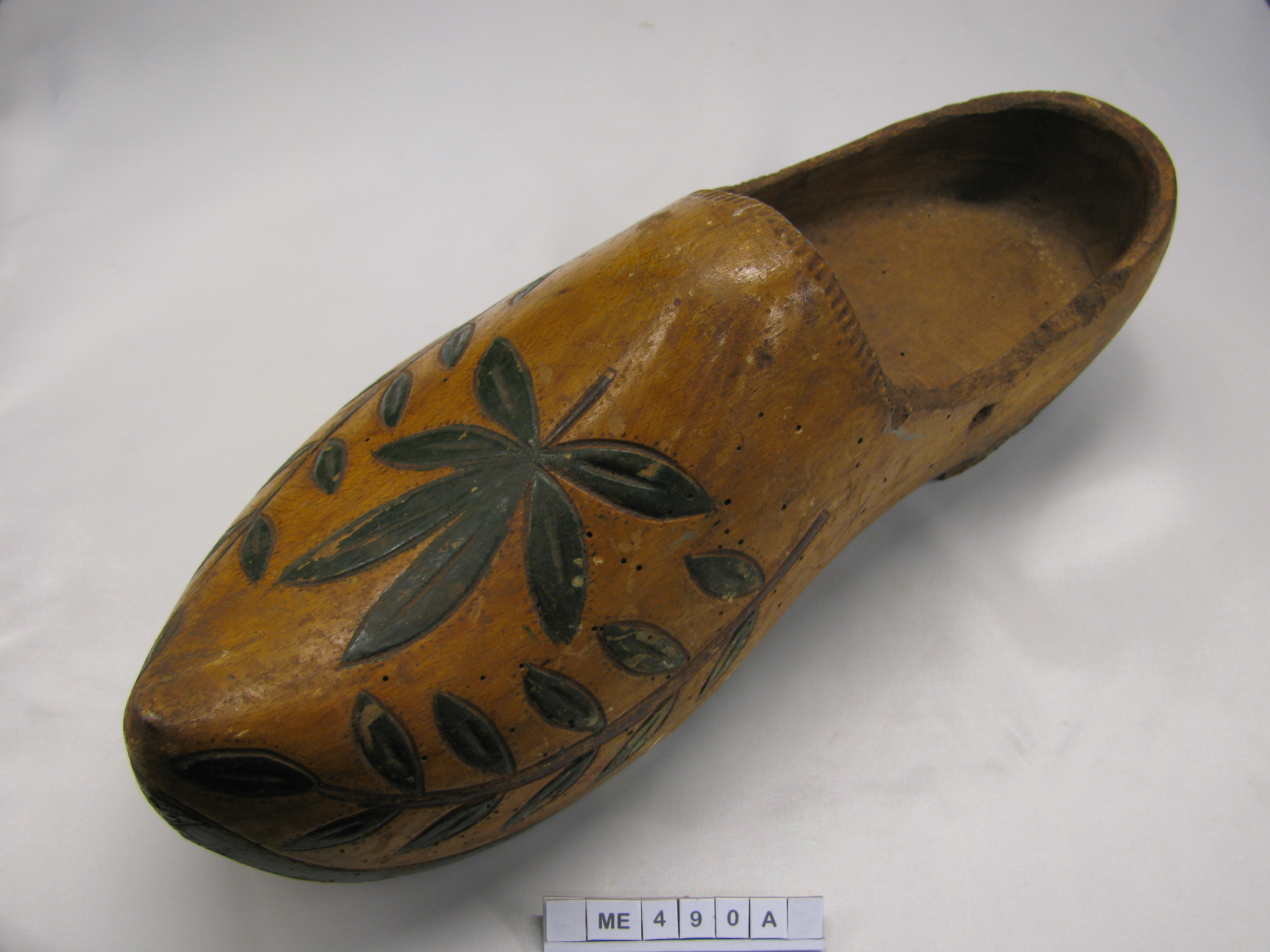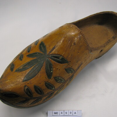 Uithangbord klomp, voor binnen, heren model. Bedekt met hoge wreef. Spitse opgaande neus. Gegraveerde bladeren en takken met groen en bruin ingekleurd. Zool simulatie door groene verf. Met hak, werkklomp. Zijkant beschadigde rand. Van Gogh heeft dergelijke klompen geschilderd.