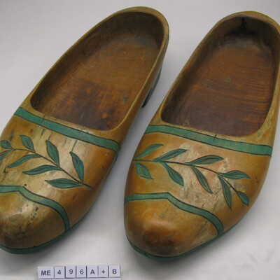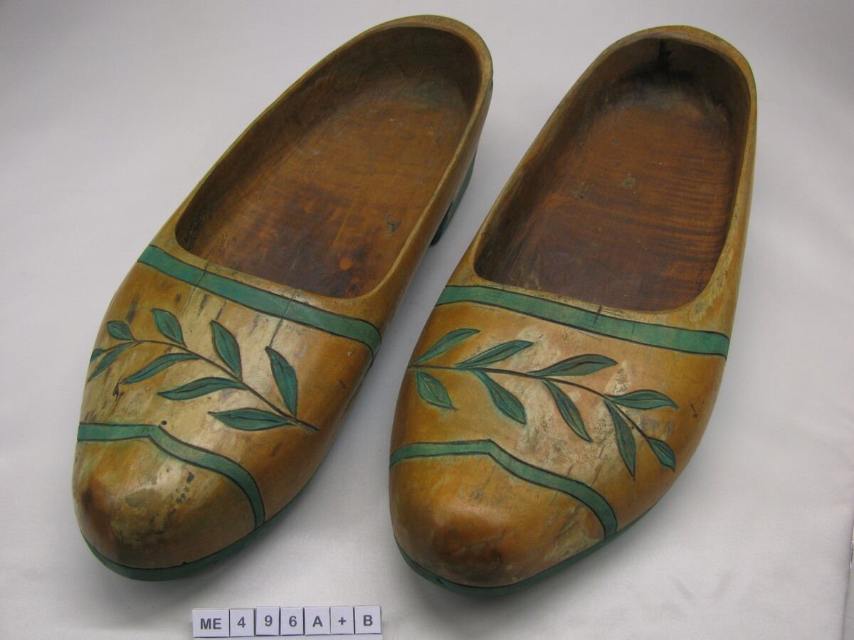 Grote herenklompen. Half bedekt met ritswerk bladeren en randen, die groen ingekleurd zijn. Stompe neus. Lage zijkanten. Met hak. Kleur: blank gelakt, groen
