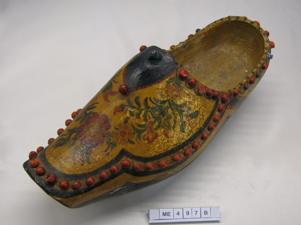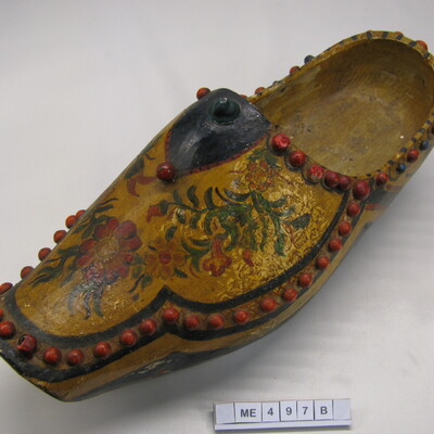 Uithangbord voor binnen. Herenklomp. Bedekt. Met brede iets opgaande neus. Polychroom met bloem en blad versiering. Randjes van houten bolletjes - vele zijn gerepareerd en weer kapot gegaan. Zijkant streepjes blad. Lage hak. Kleur: geel geverfd, groen rood blauw.