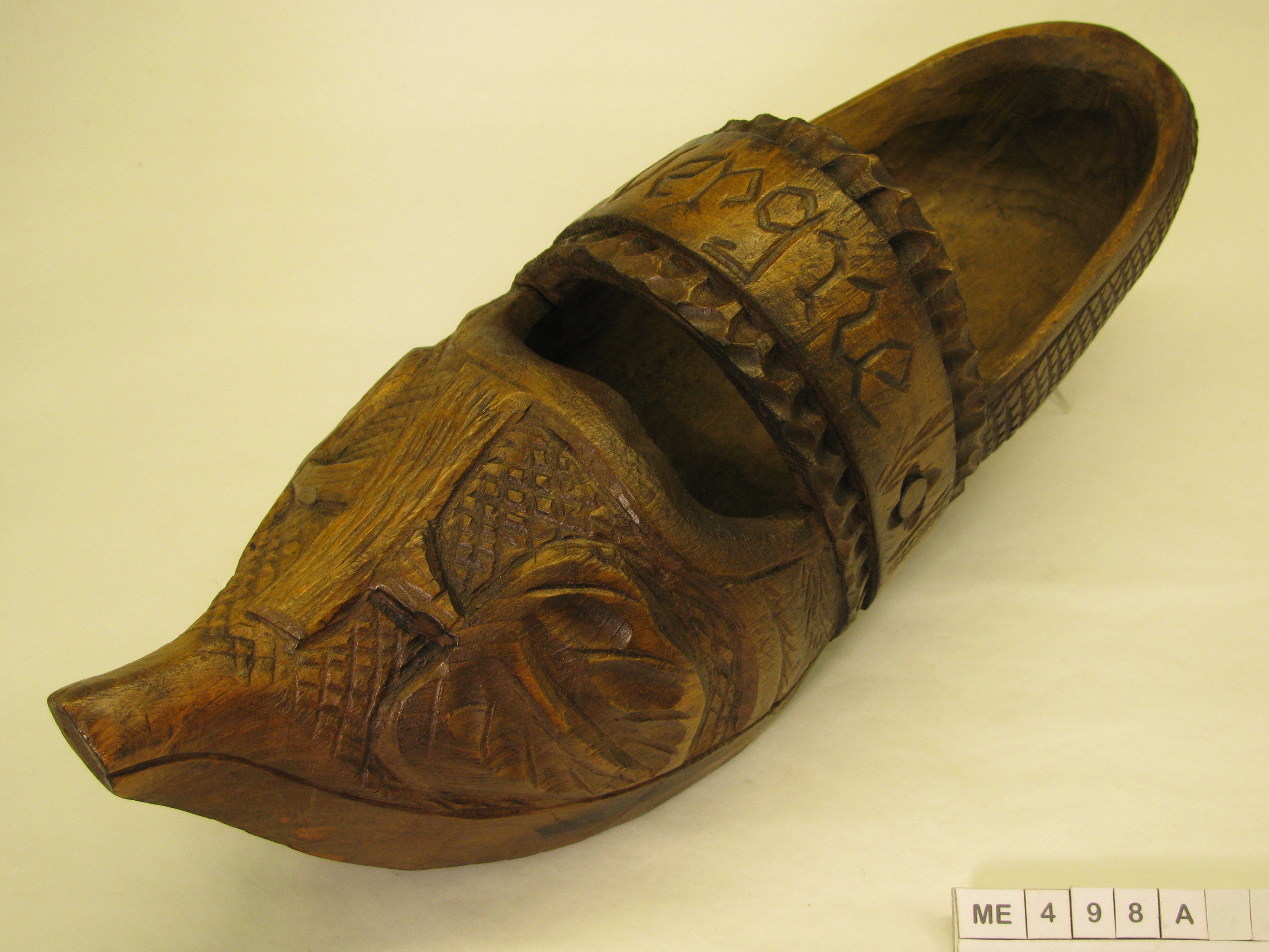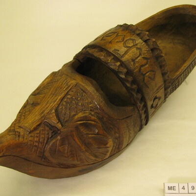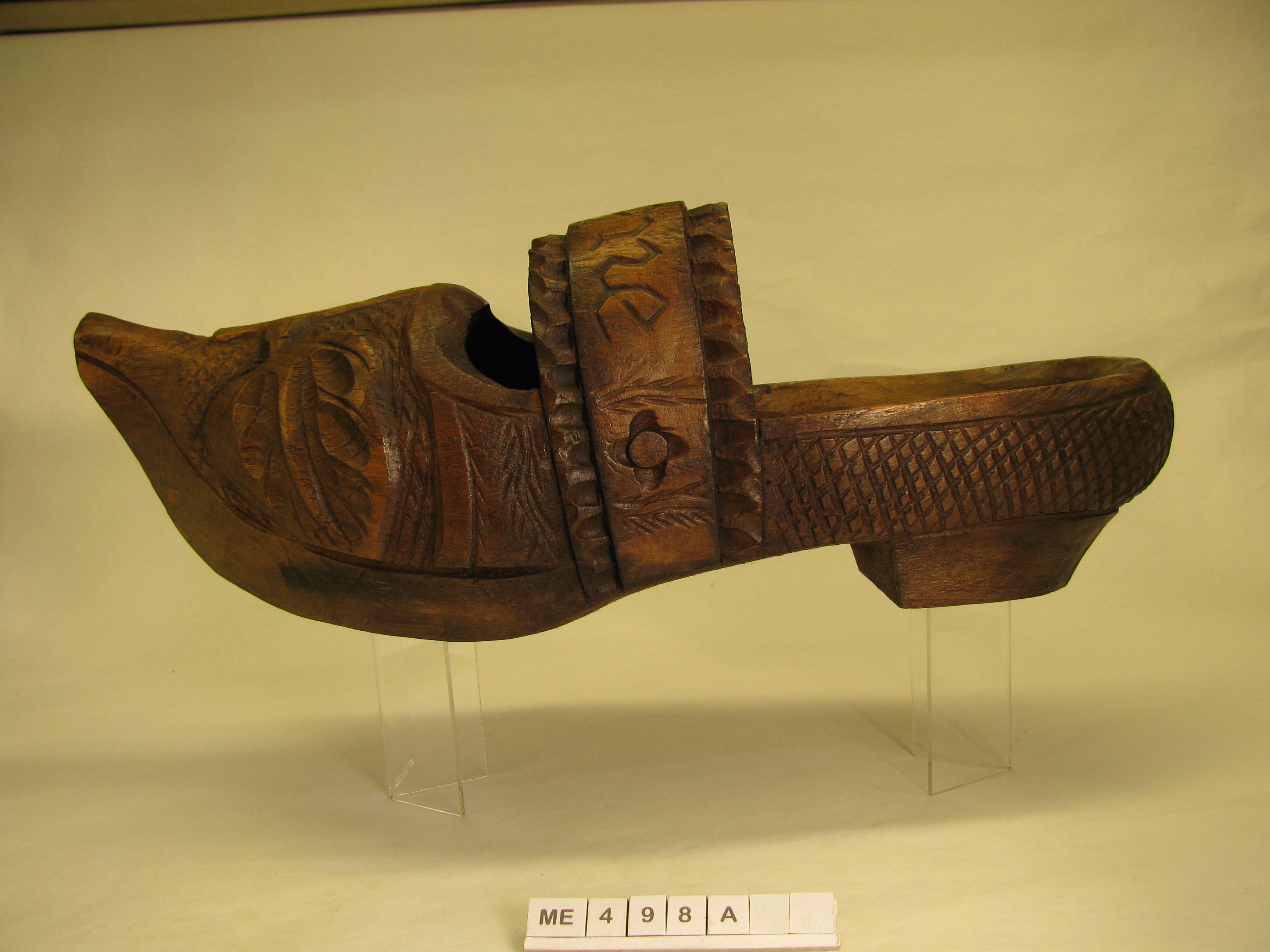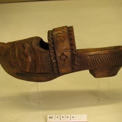 Sierklomp, tripklomp met lage hak en opgaande punt/neus. Imitatie wreefband met naam in ritswerk (AUVERGNE). Ritswerk op gehele klomp. Sculpture van tak en twee bladeren op kap.