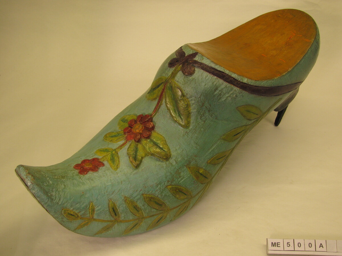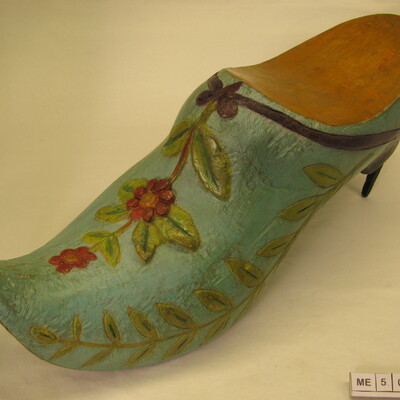 Uithangbord Klomp (enseigne). Niet uitgeholde, grote kapklomp met hak en breed opgaande neus. Onder de klomp zit een grote ijzeren haak om deze klomp op te hangen. Ritswerk zijkant: tak, bladeren. Op de kap sculptures bladeren en bloemen. Polychroom.