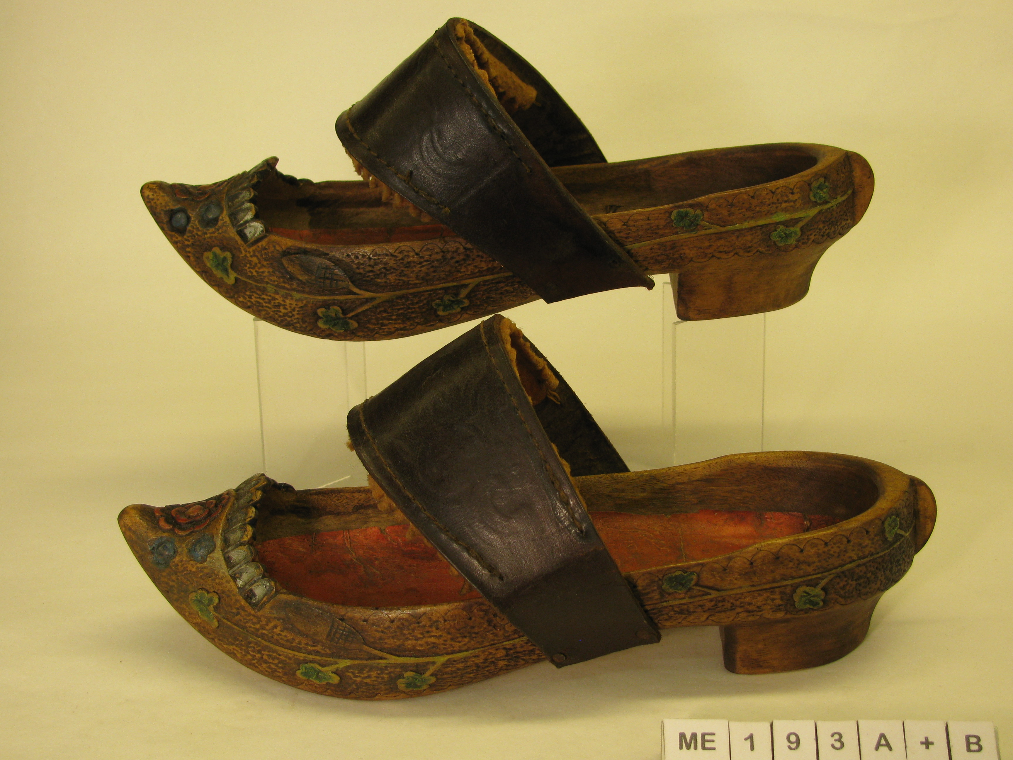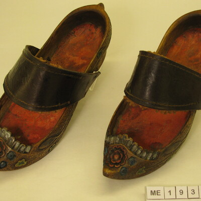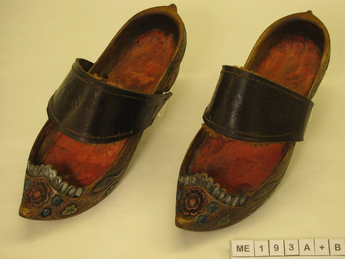 Kinderklompen, kapklomp, kwart bedekt, socque model. Opgaande punt, hoge hak, puntige hiel. Rondom hele model sculptures van takken, bladeren, eikels. Kaprand gelobt met bloemsculpture op kap. Onleesbaar etiket. Polychroom.