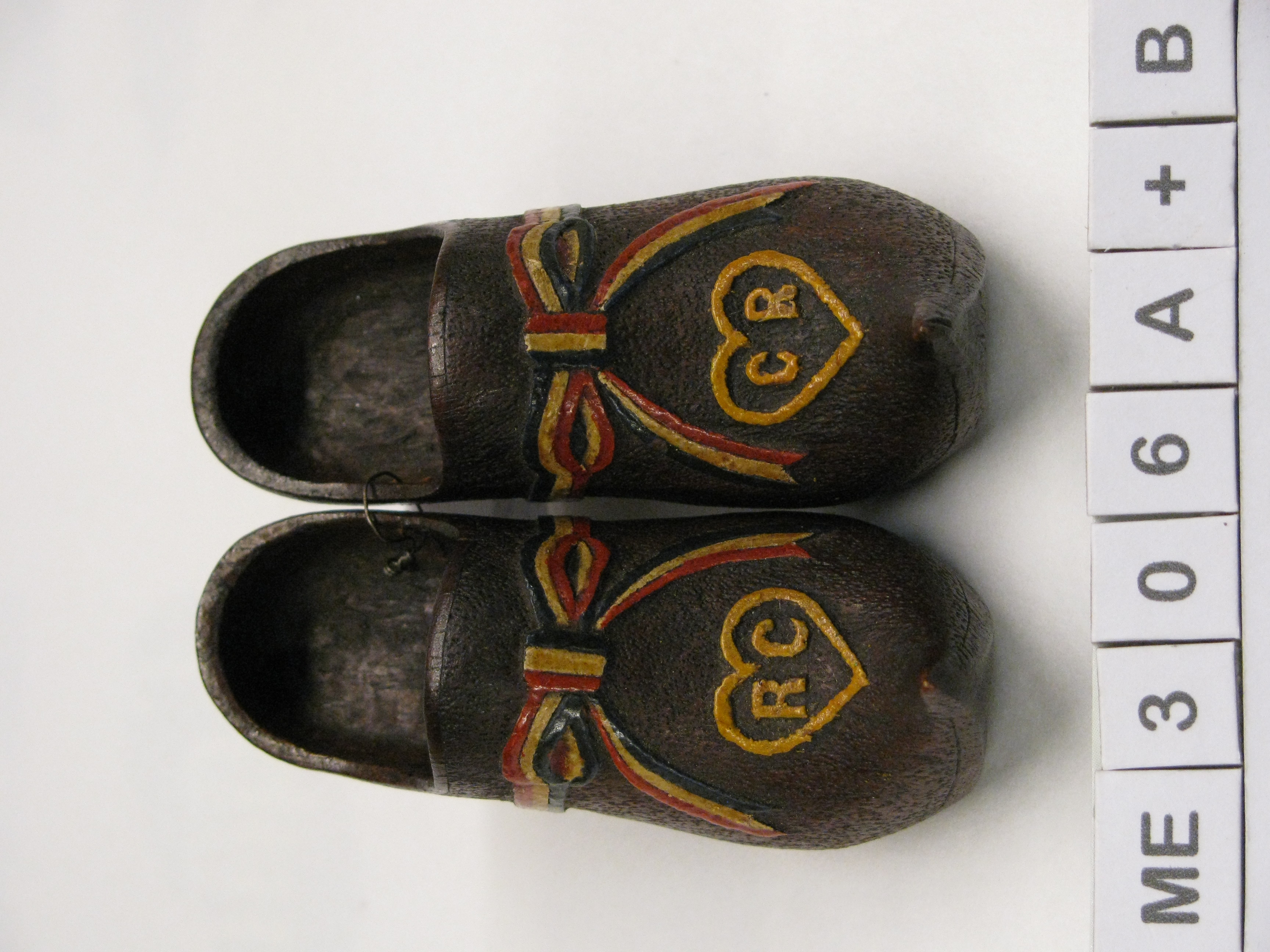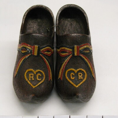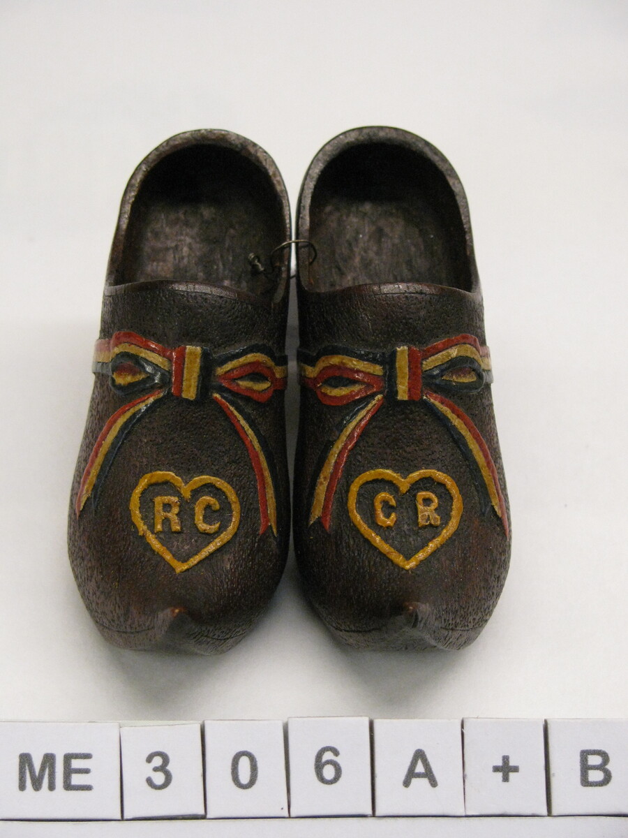 Modelklompen, bedekt. Scherpe opgaande spitse neus. Graveerwerk van zandstructuur en lint (in kleuren van Franse vlag) op kap en hartjes met letters R C (op A) en C R (op B). Zool imitatie. Met hak, rechte hiel. Bruin, rood, wit, blauw, geel.