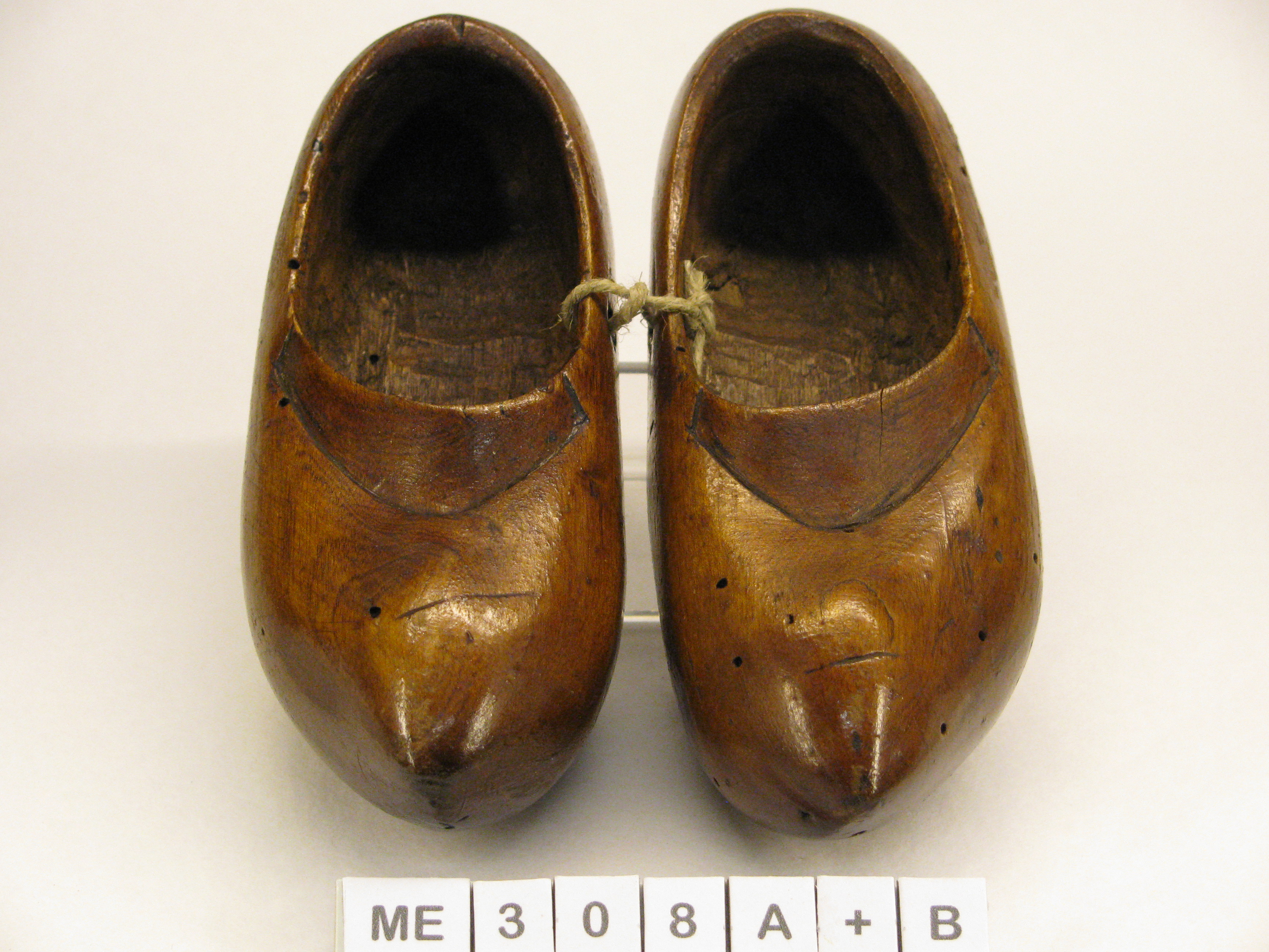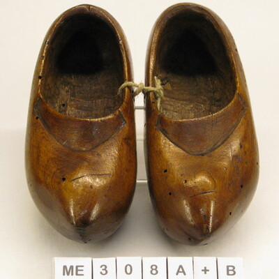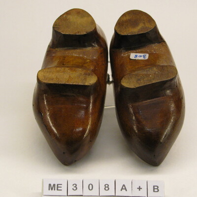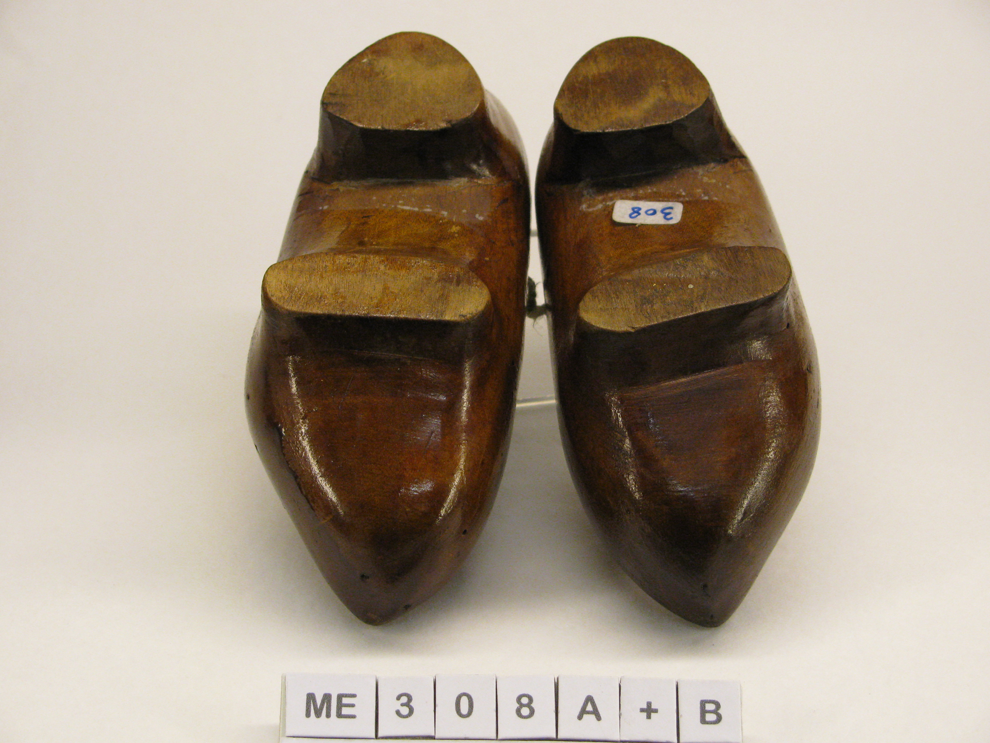Modelklompen, kapklompen. Forse punt. Verhoging onder voorvoet. Ronde hak. Wreef afgevlakt. Bruin gelakt.