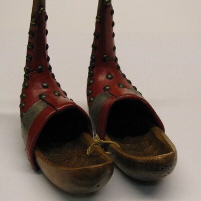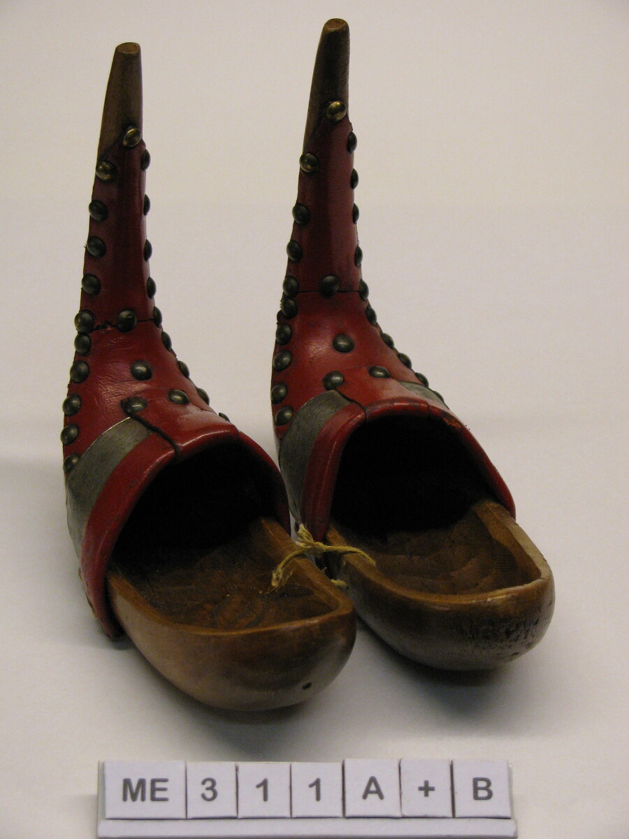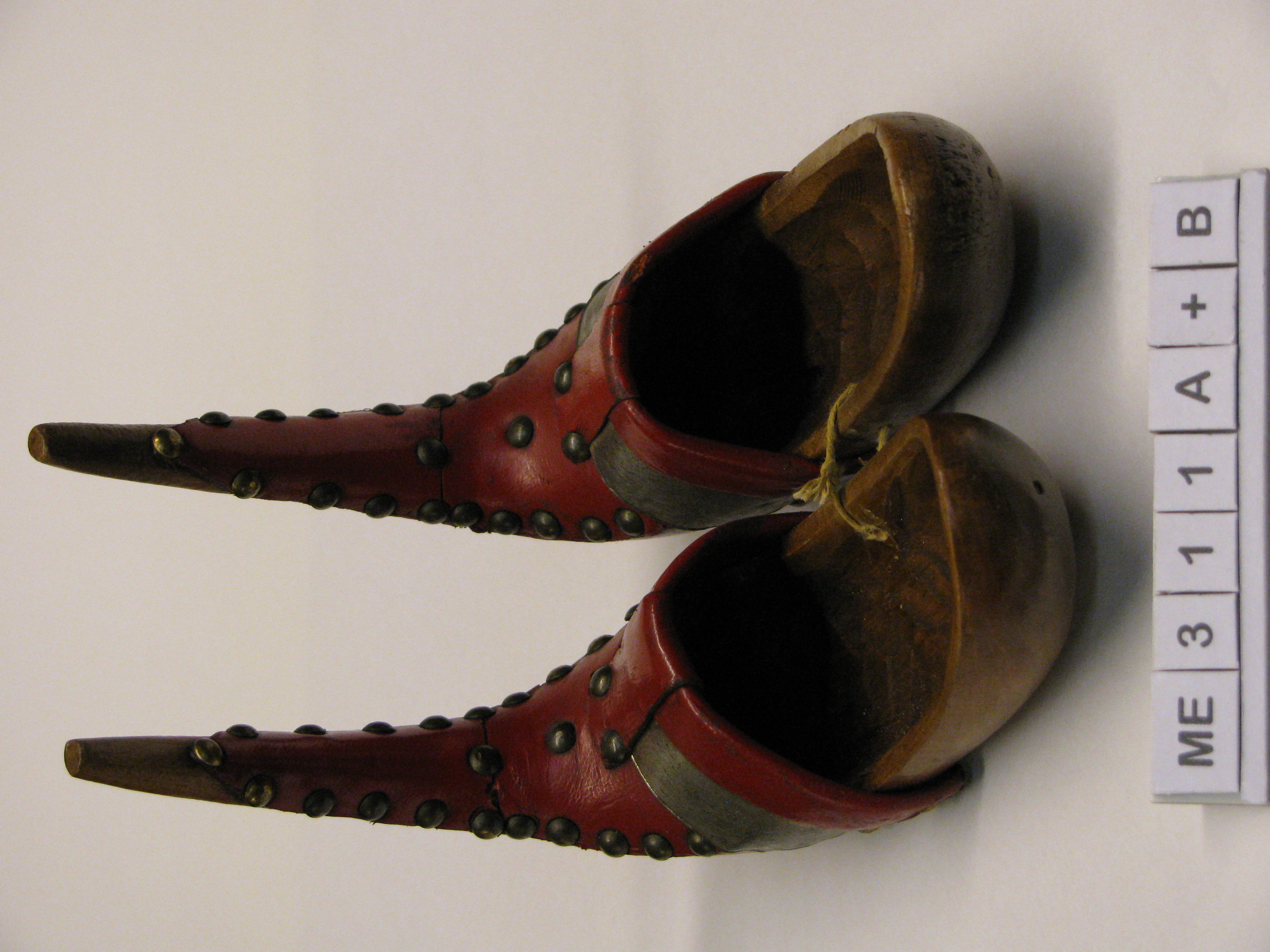 Modelklompen, model bethmale. Houten zeer hoge opgaande neus. Wreefband van ijzer en er overheen leer vastgezet met messing nagels. Geen hak. Blank gelakt, rood.