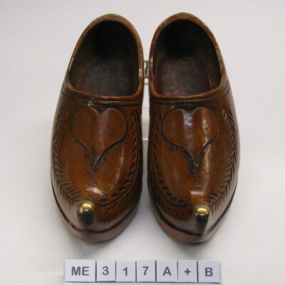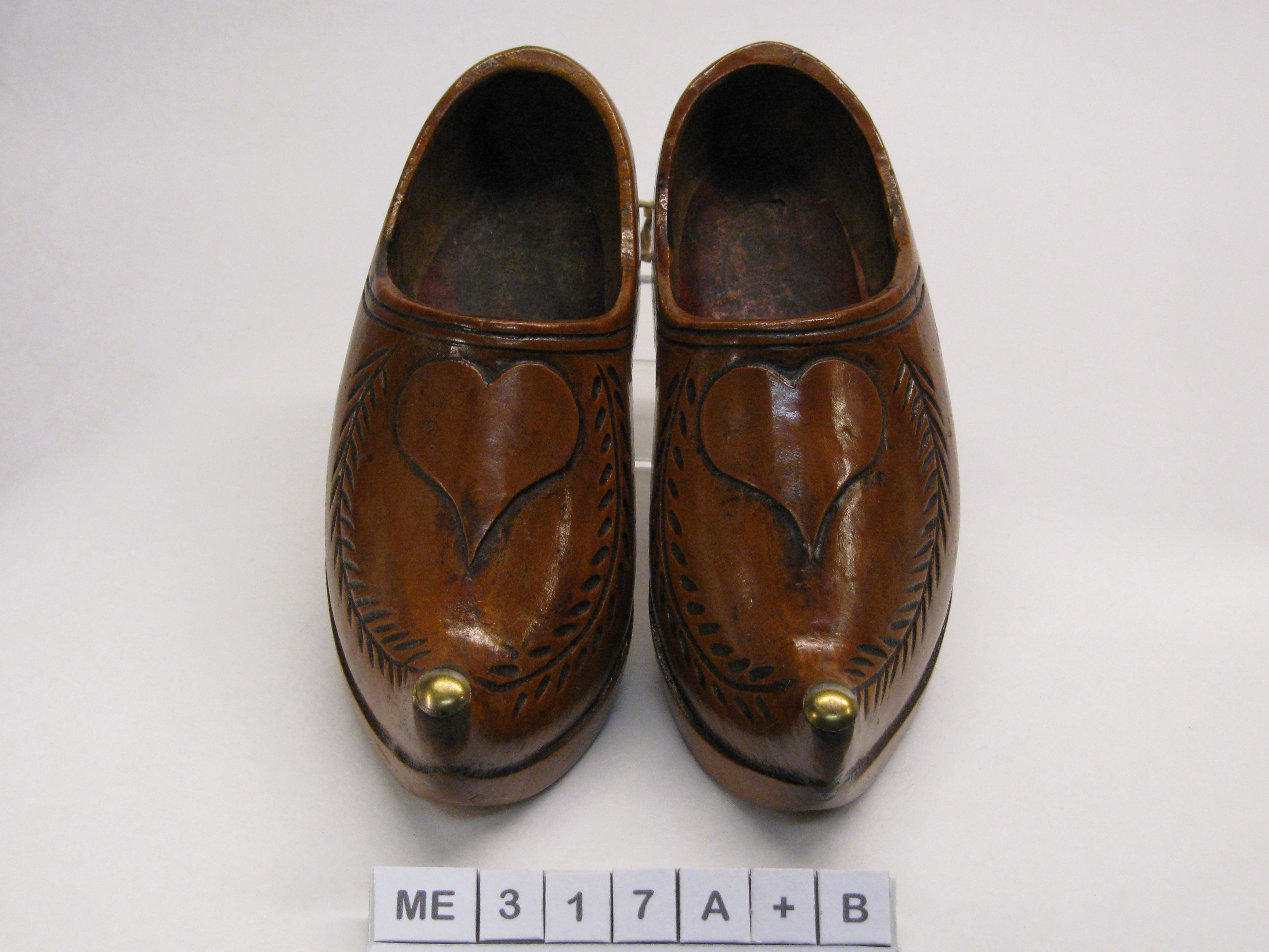 Modelklompen (kinderklompen), bedekt. Spitse opgaande neus met messing nagel. Gravering van hartje op kap met takjes erlangs. Zool imitatie rand. Hak loopt in punt uit. Tekst op zool: Ltn. E. v. Dippe. Op hak: 17169. Etiket op binnenzool. Touwtje door de hak. Roodachtig gelakt.