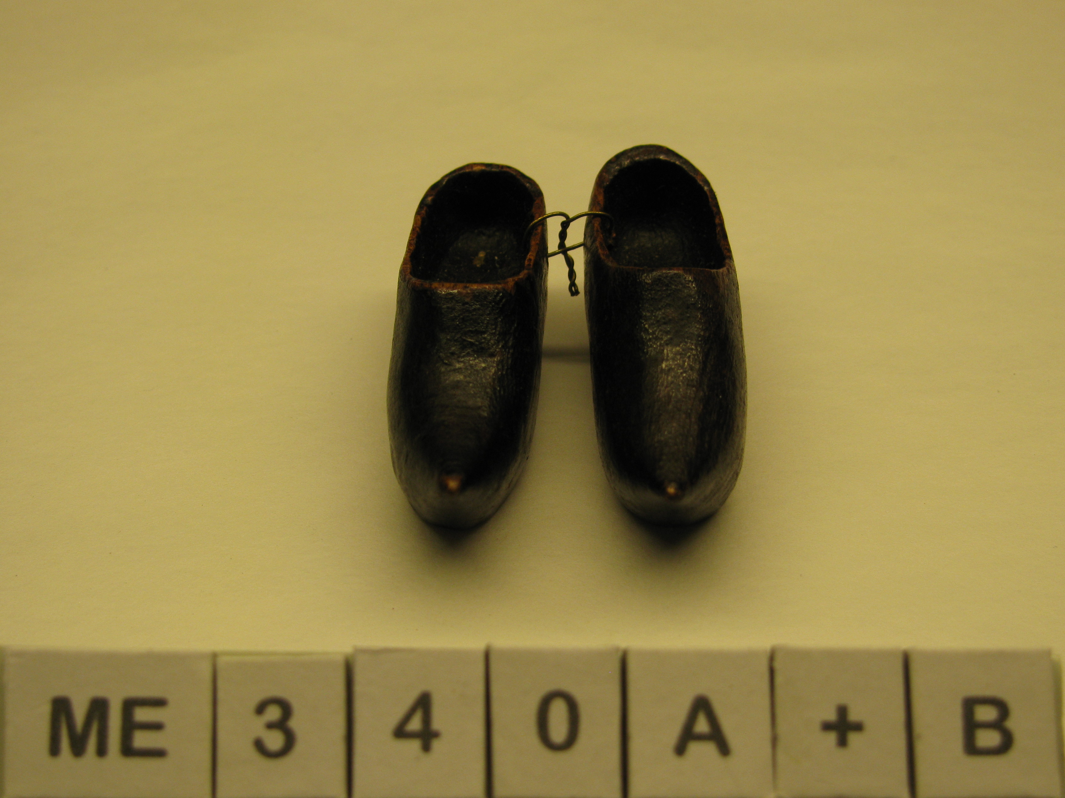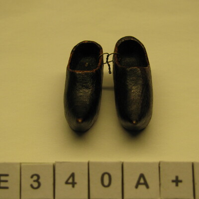 Modelklompen, klein, bedekt. Met spitse opgaande punt. Met hak en grote instap. Rood gelakt.