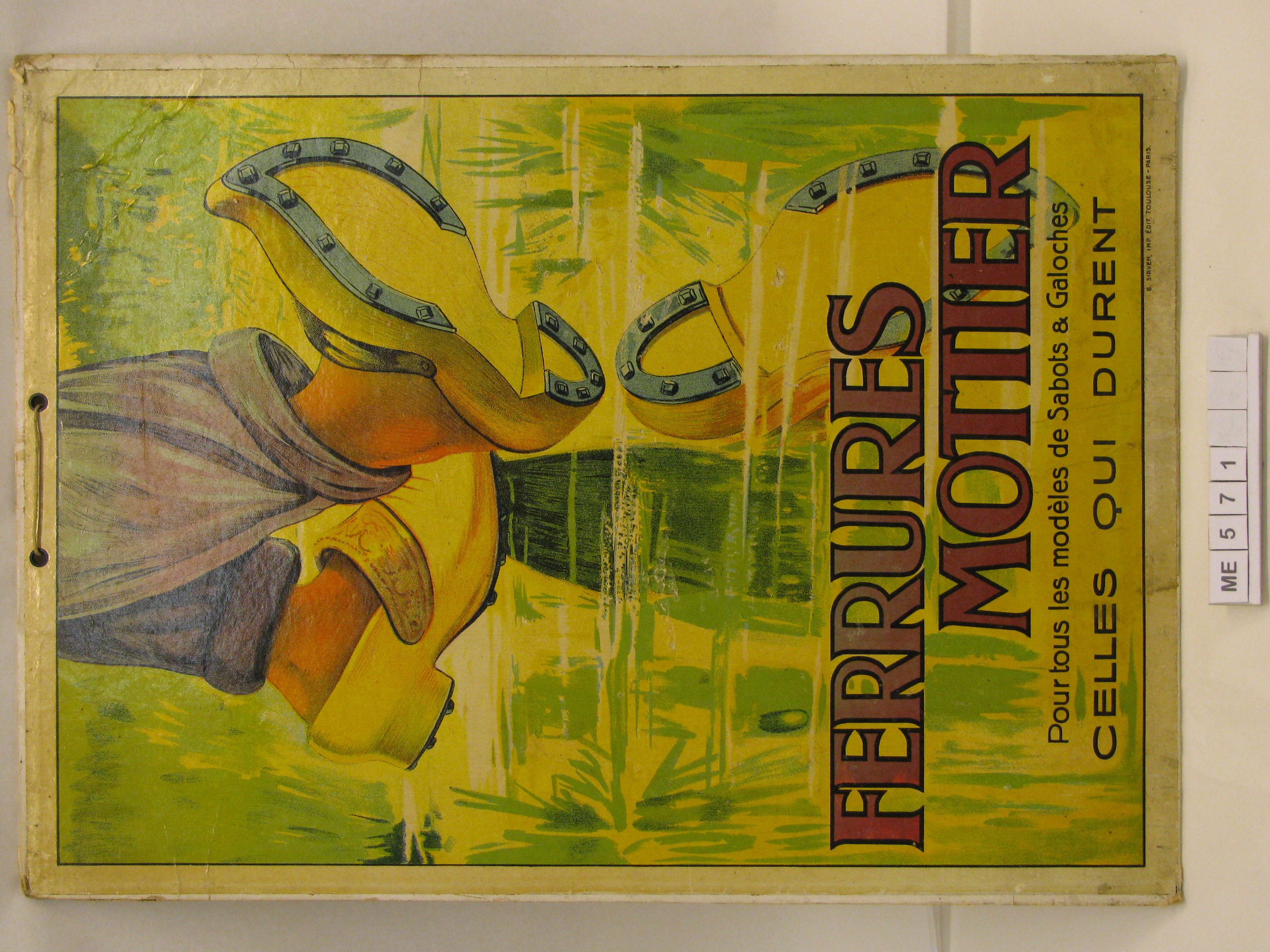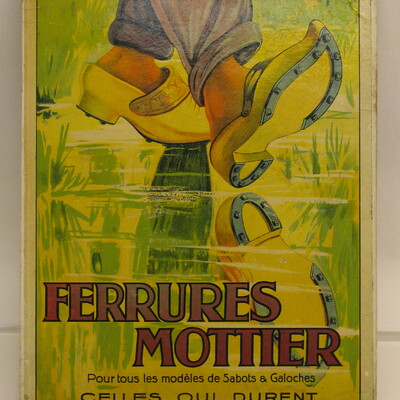 Tekst op bord: "Ferrures Mottier. Pour tous les modèles de Sabots a Galoches. Celles Qui Durent. B. Sivren ,imp. édit. Toulouse - Paris."