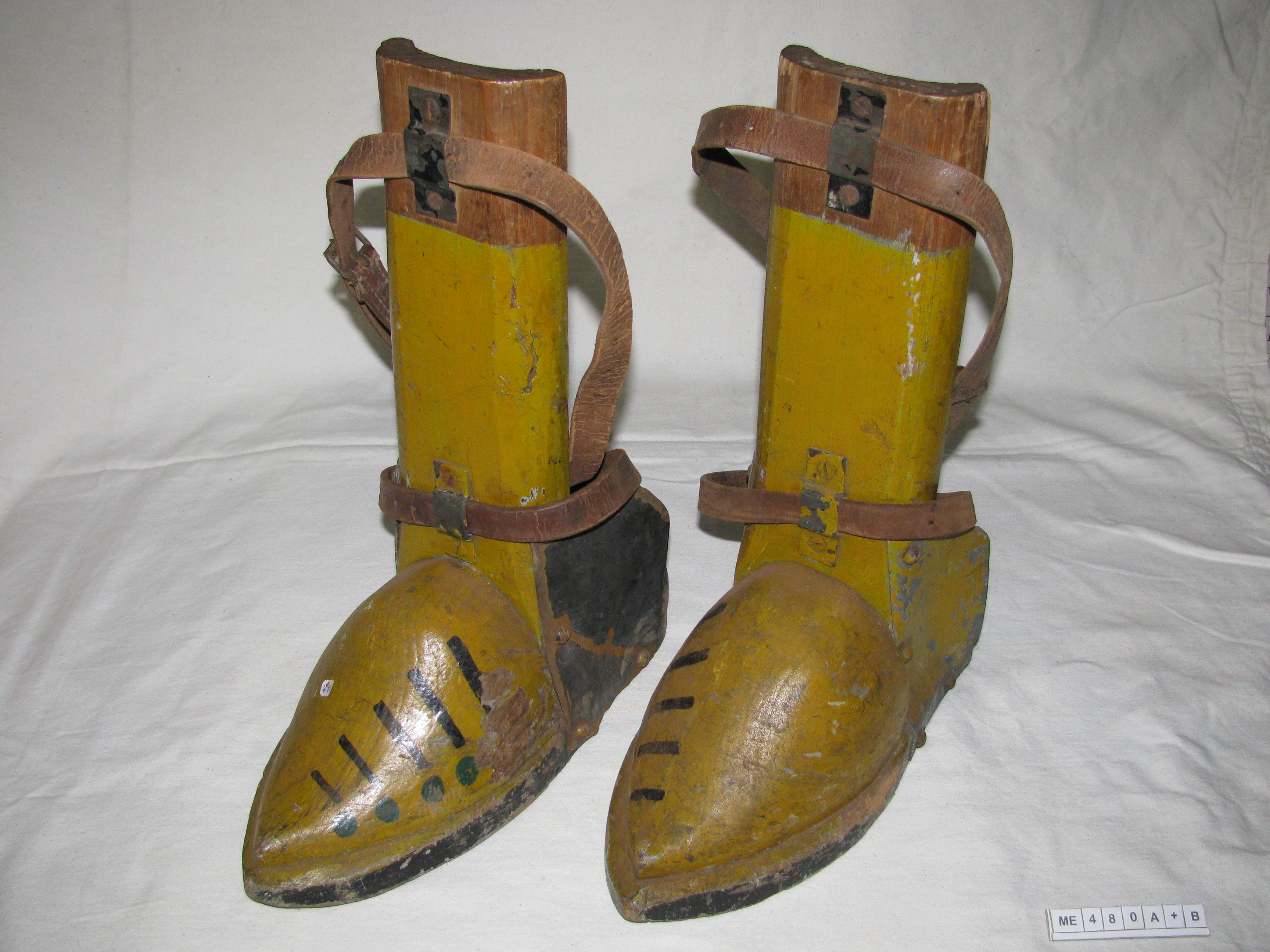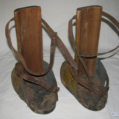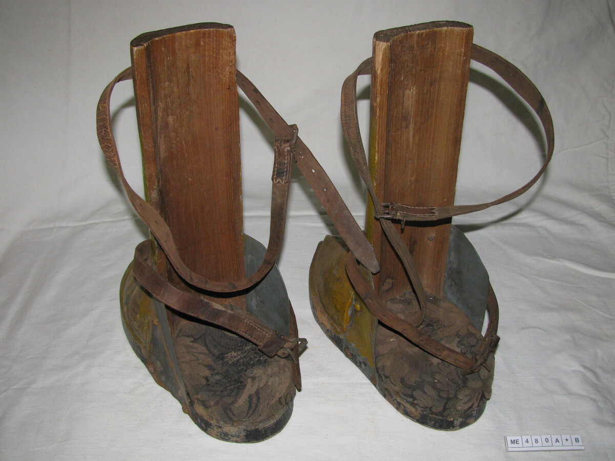 Klompvorm, met dikke houten zool. Met gesloten kapvorm, daarop houten plank met twee riemen. Op de "hak" een kussentje met blikken zijden. Geel, zwart, groen.