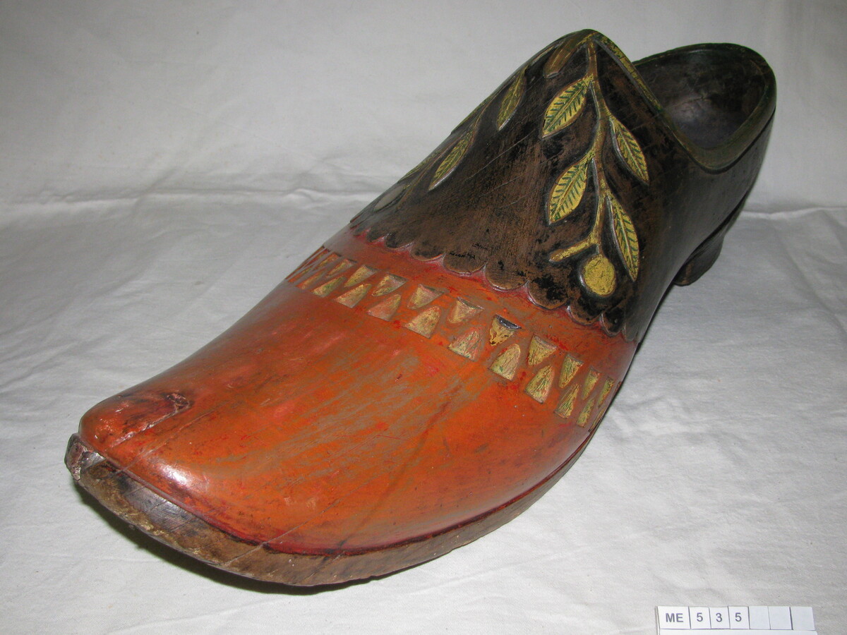 Uithangbord klomp, kapklomp. Hoge hak en brede opgaande neus. Hoge wreef. Gravure versiering over de kap met sculptures van 2 olijftakken met bladeren. Ophang oog. Oranje, zwart, groen.